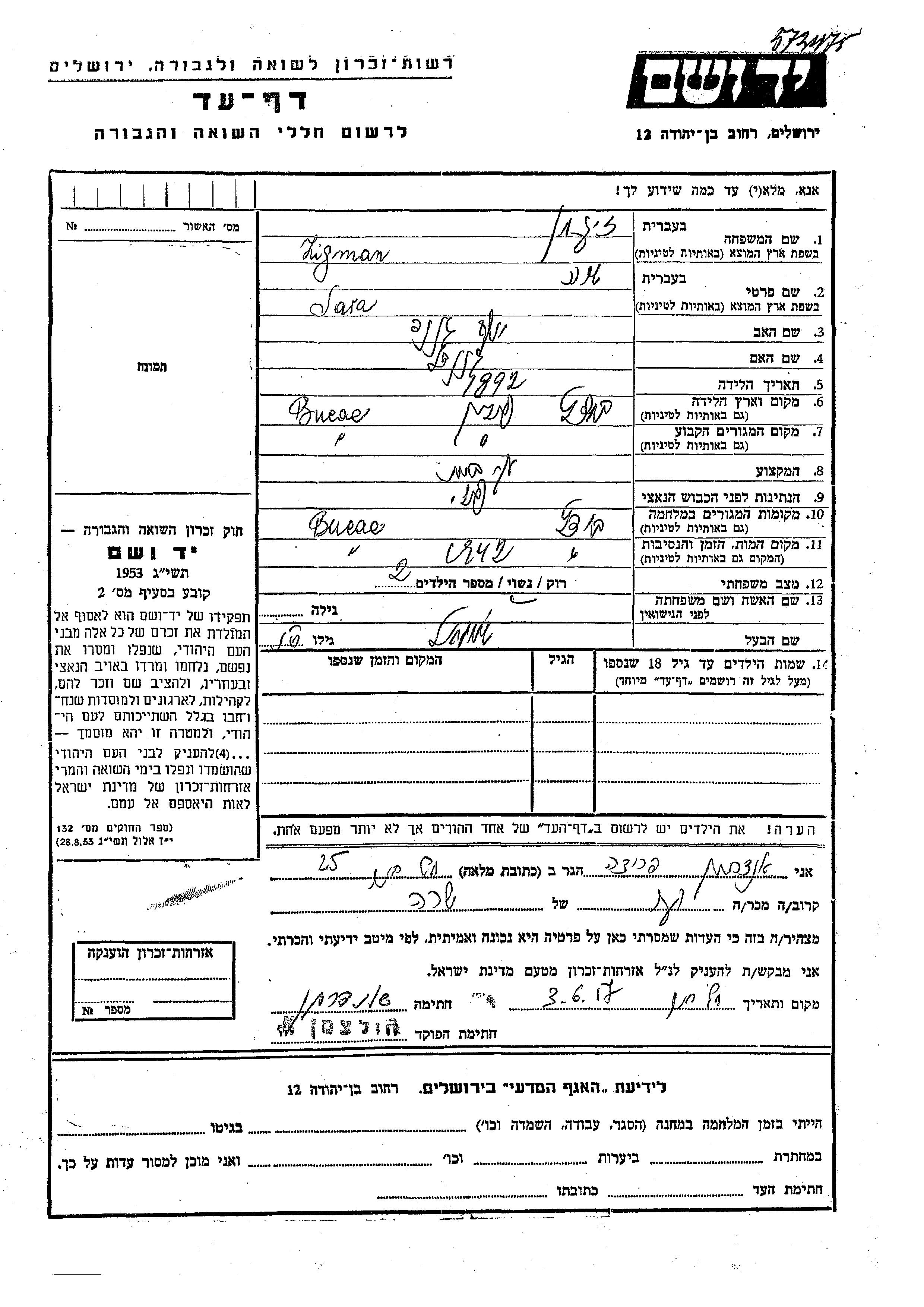 Sara Zigman est née à Buczacz, Pologne en 1892, fille de Volf et de Genendl. Elle était Femme au foyer et Mariée à Shmuel. Avant la seconde guerre mondiale elle vivait à Buczacz, Pologne. Pendant la guerre, elle était à Buczacz, Pologne.
