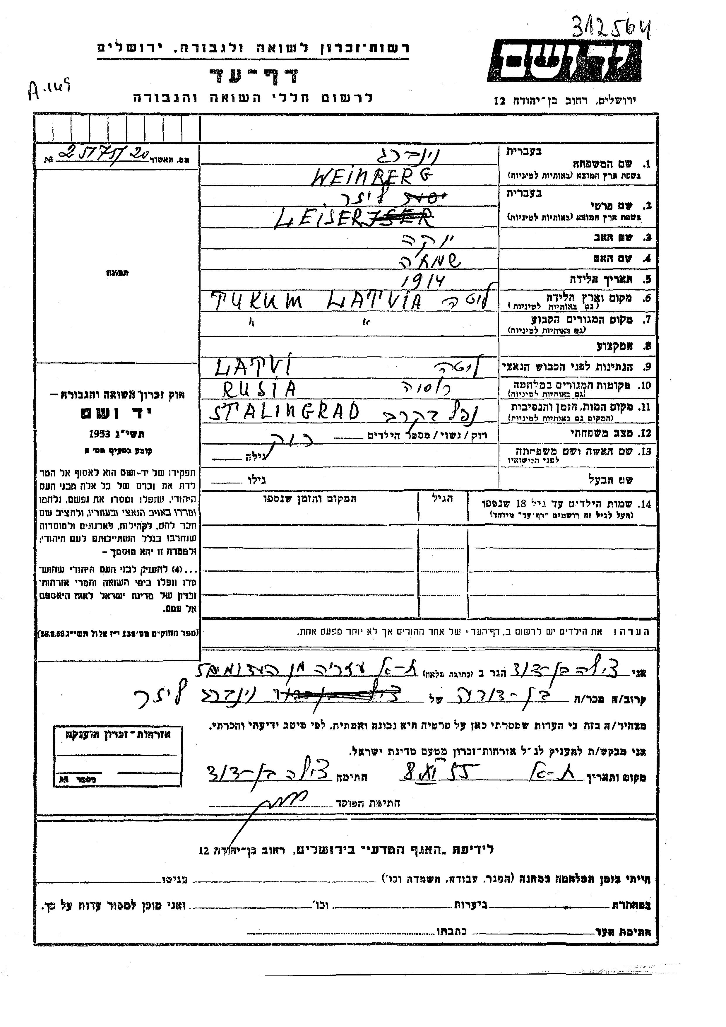 Leiser Weinberg est né à Tukum, Lettonie en 1914, fils de Yaakov et de Simkha. Il était Célibataire. Avant la seconde guerre mondiale il vivait à Tukum, Lettonie. Au cours de la guerre, il était à Russie (URSS).
