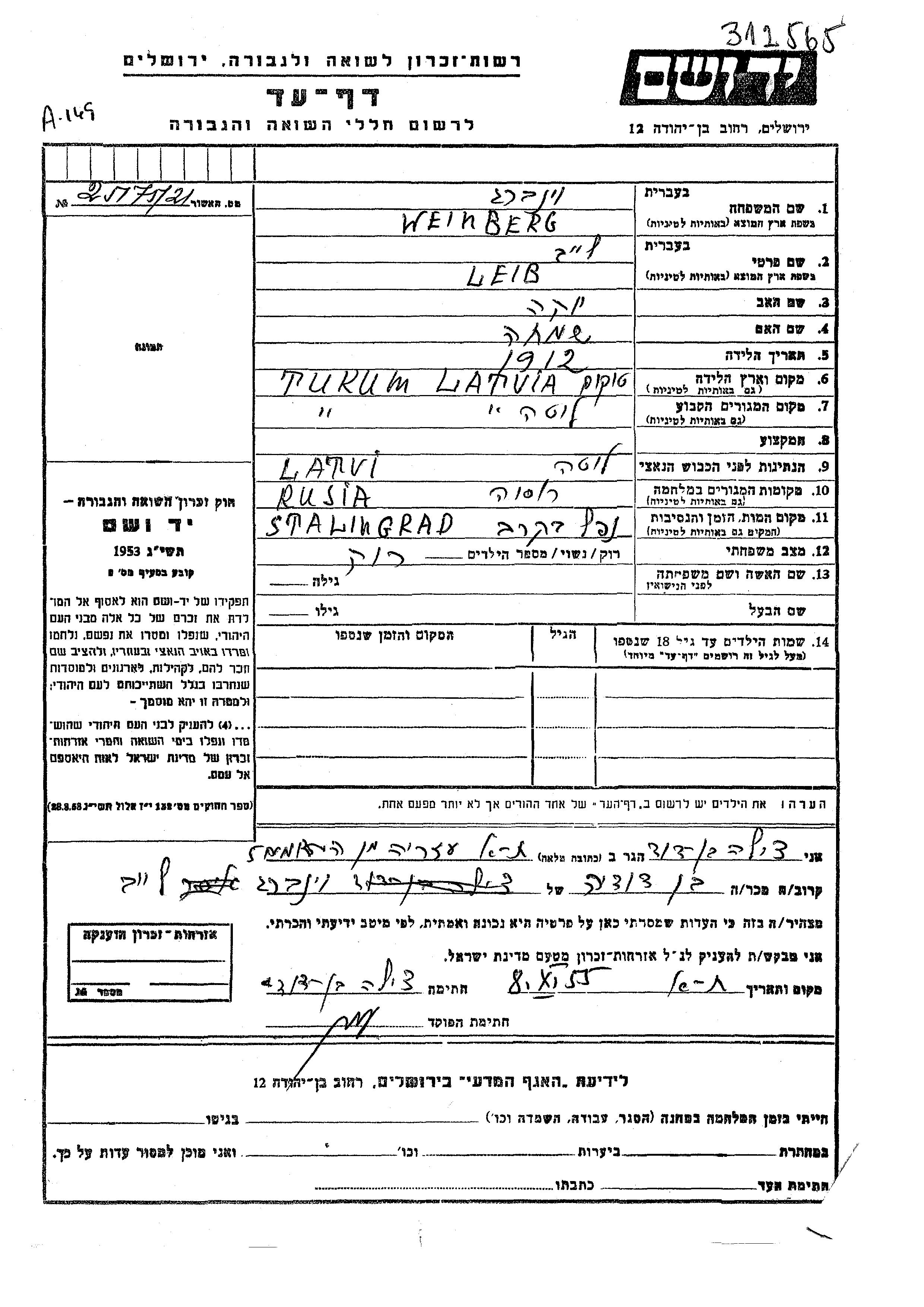 Leib Weinberg est né à Tukum, Lettonie en 1912, fils de Yaakov et de Simkha. Il était Célibataire. Avant la seconde guerre mondiale il vivait à Tukum, Lettonie. Au cours de la guerre, il était à Russie (URSS).
