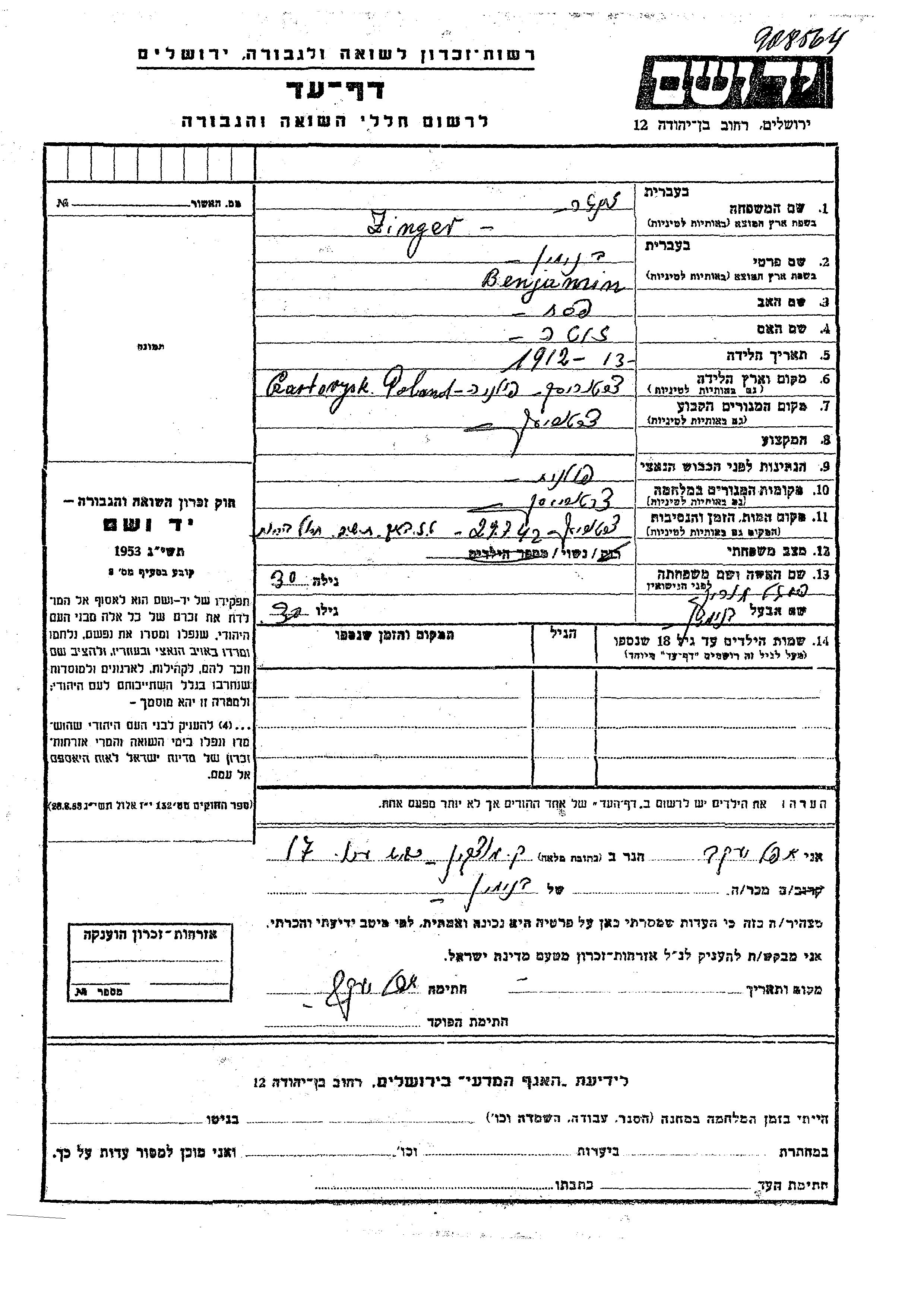 Zinger Benjamin 1912 Czartorysk, Pologne Feuille de témoignage