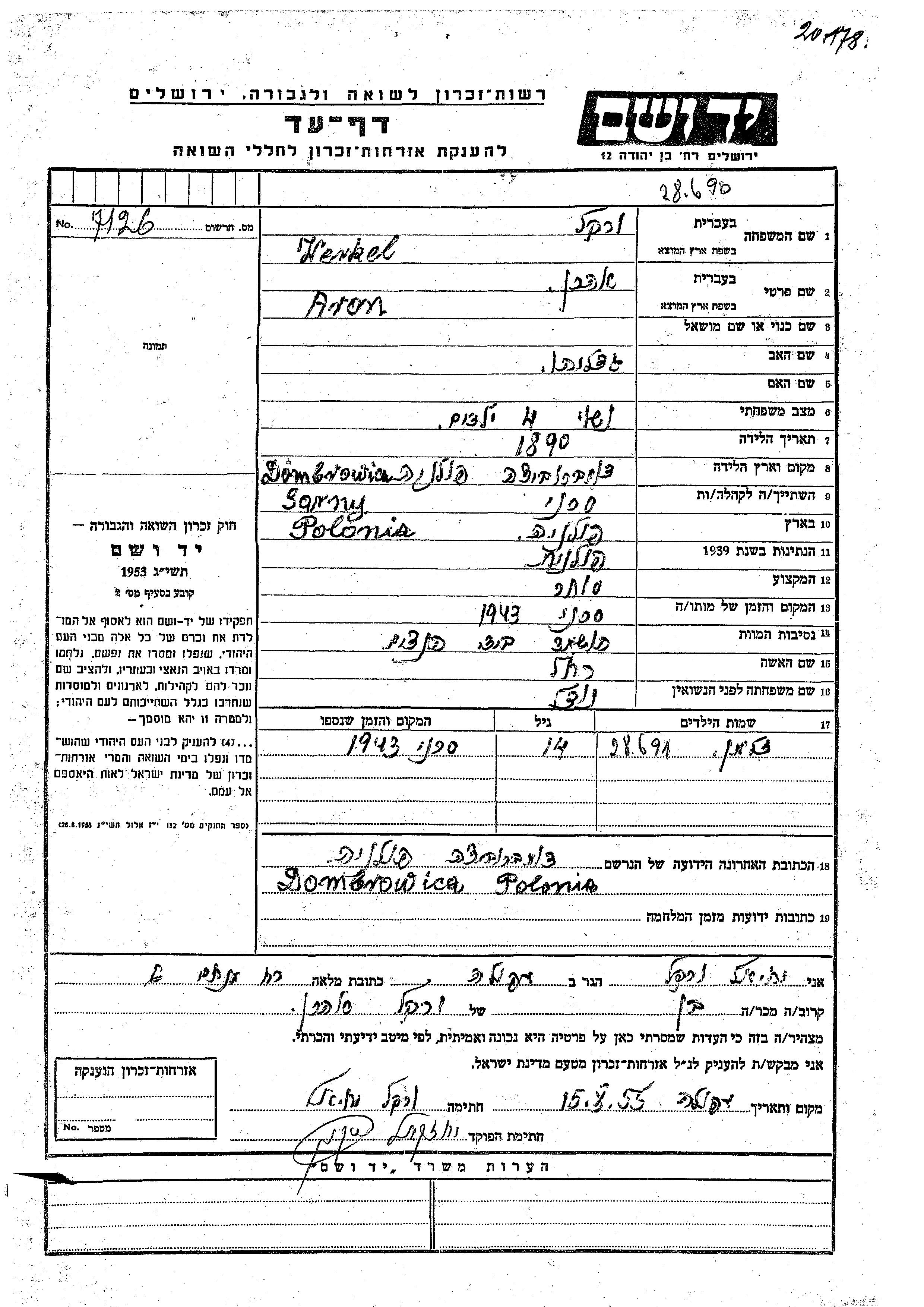 Werkel Aron 1890 Dombrowica, Pologne Feuille de témoignage