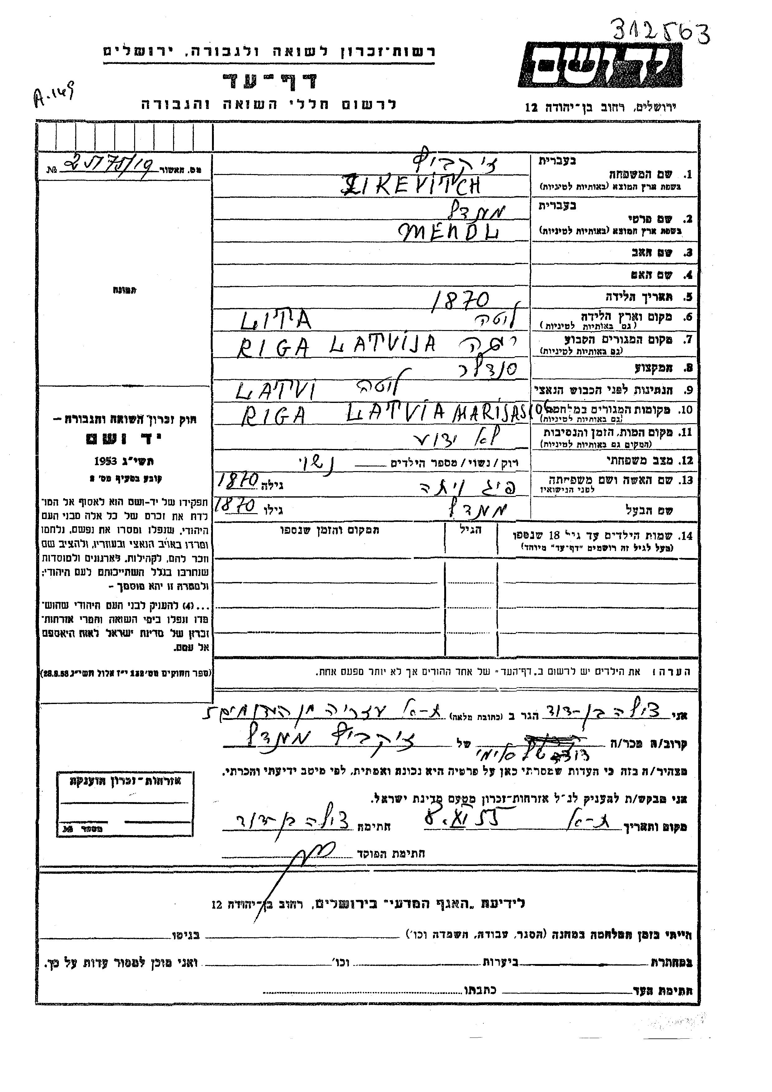 Mendl Zikevitch est né à Lituanie en 1870. Il était Cordonnier et Mariée à Vita née Fig. Avant la seconde guerre mondiale il vivait à Riga, Lettonie. Au cours de la guerre, il était à Riga, Lettonie.