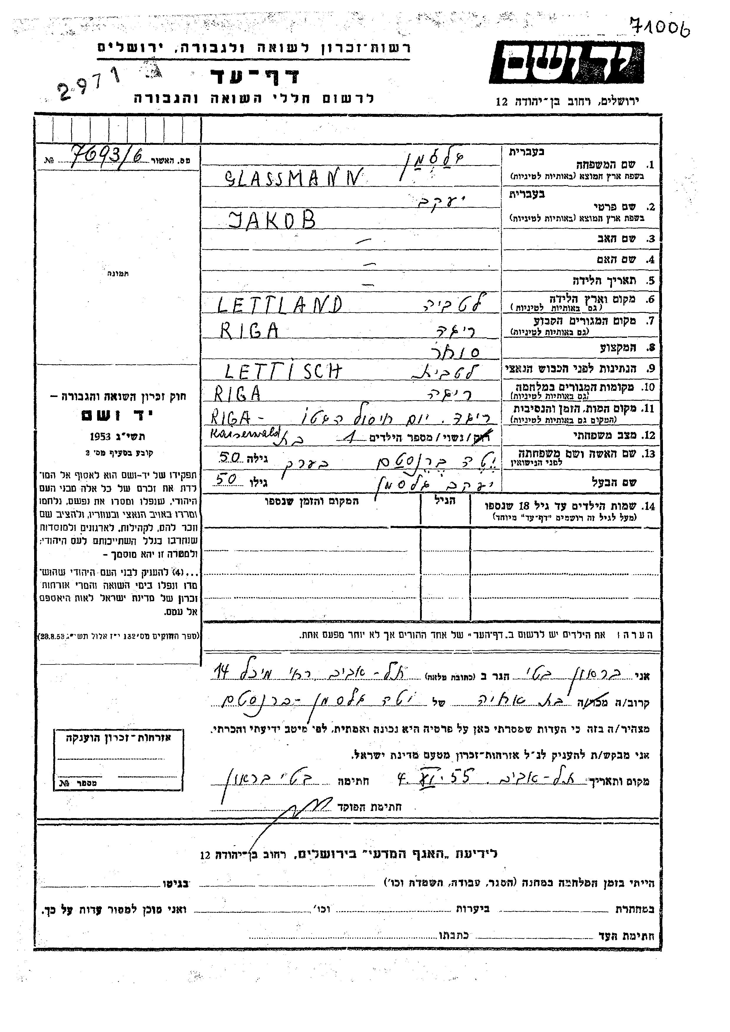 Glassmann Jakob Riga, Lettonie Feuille de témoignage