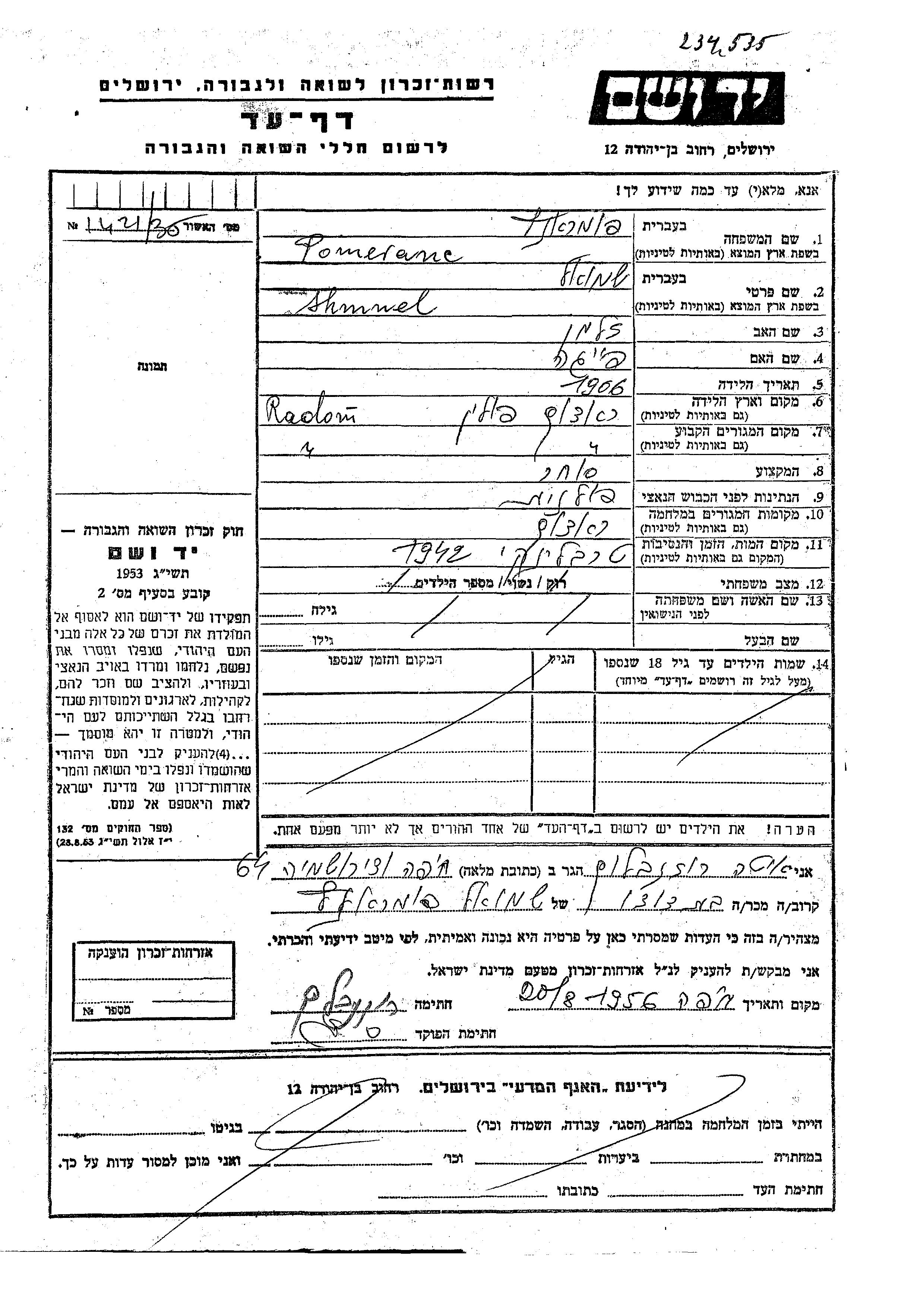Pomeranc Shmuel 1906 Radom, Pologne Feuille de témoignage