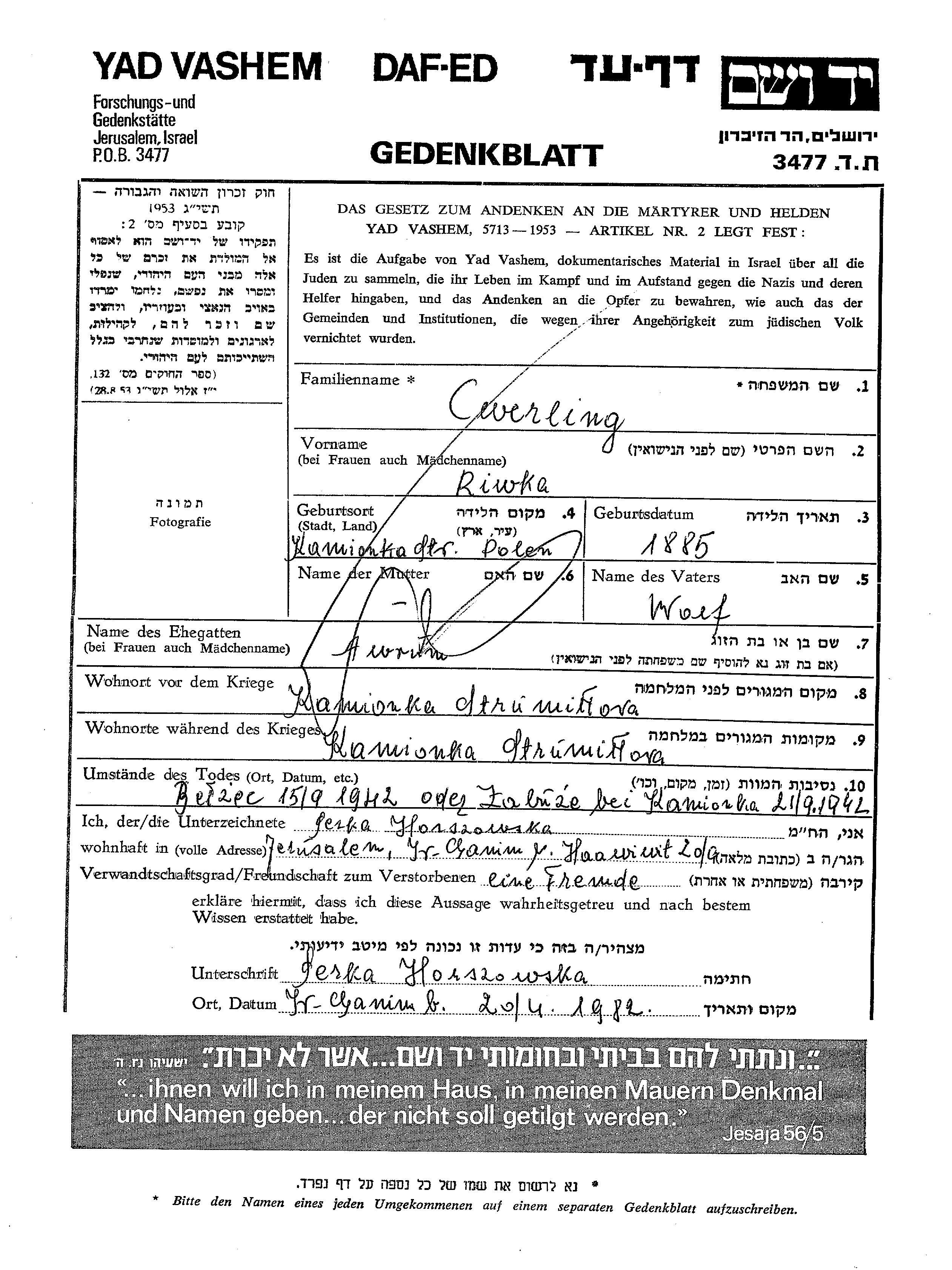 Cwerling Riwka 1885 Kamionka Strumiłowa, Pologne Feuille de témoignage