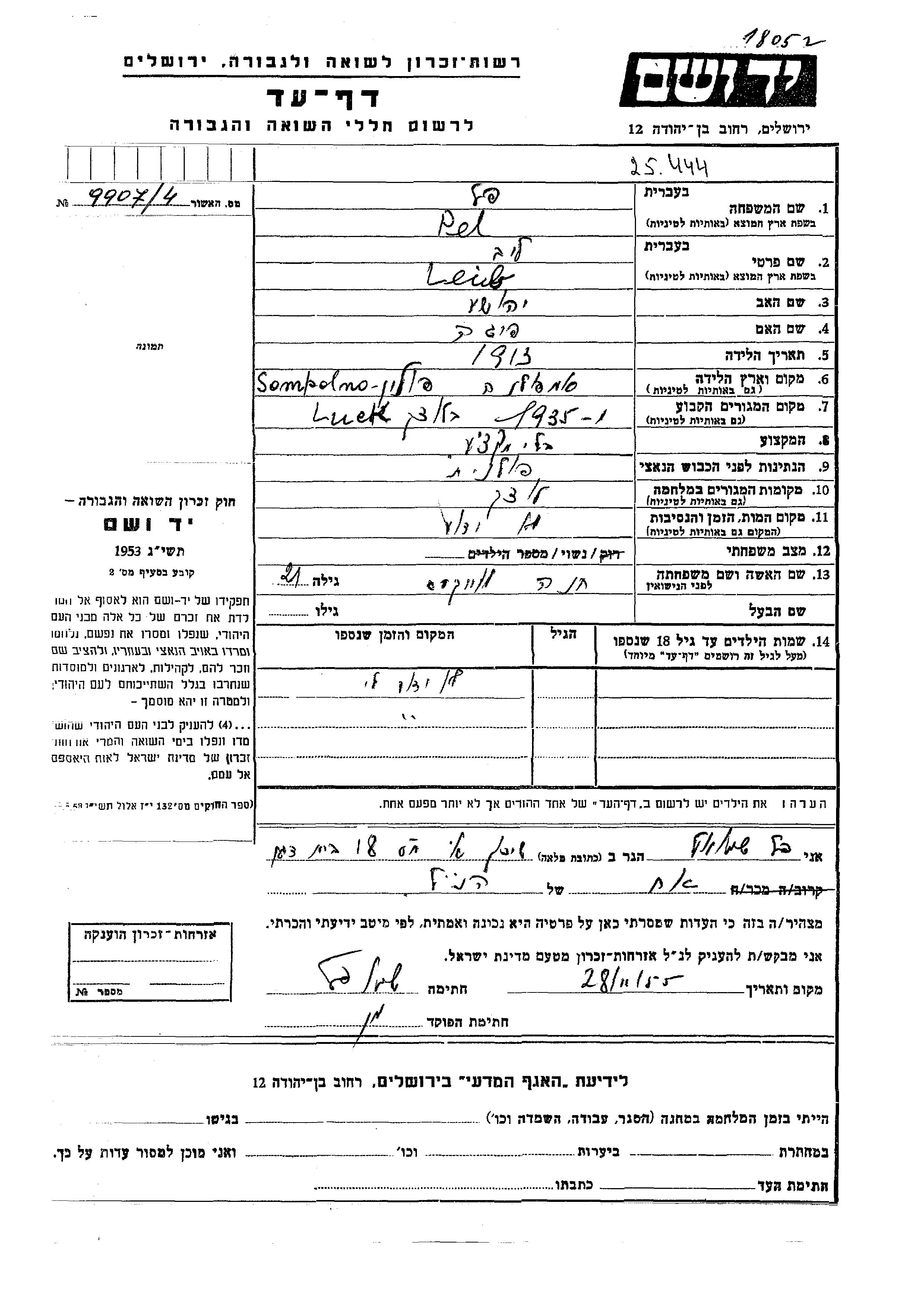 Leib Pel Pal est né à Sompolno, Pologne en 1913, fils de Yehoshua et de Feiga. Il était Mariée à Khana née Veikus. Avant la seconde guerre mondiale il vivait à Luck, Pologne. Au cours de la guerre, il était à Luck, Pologne.