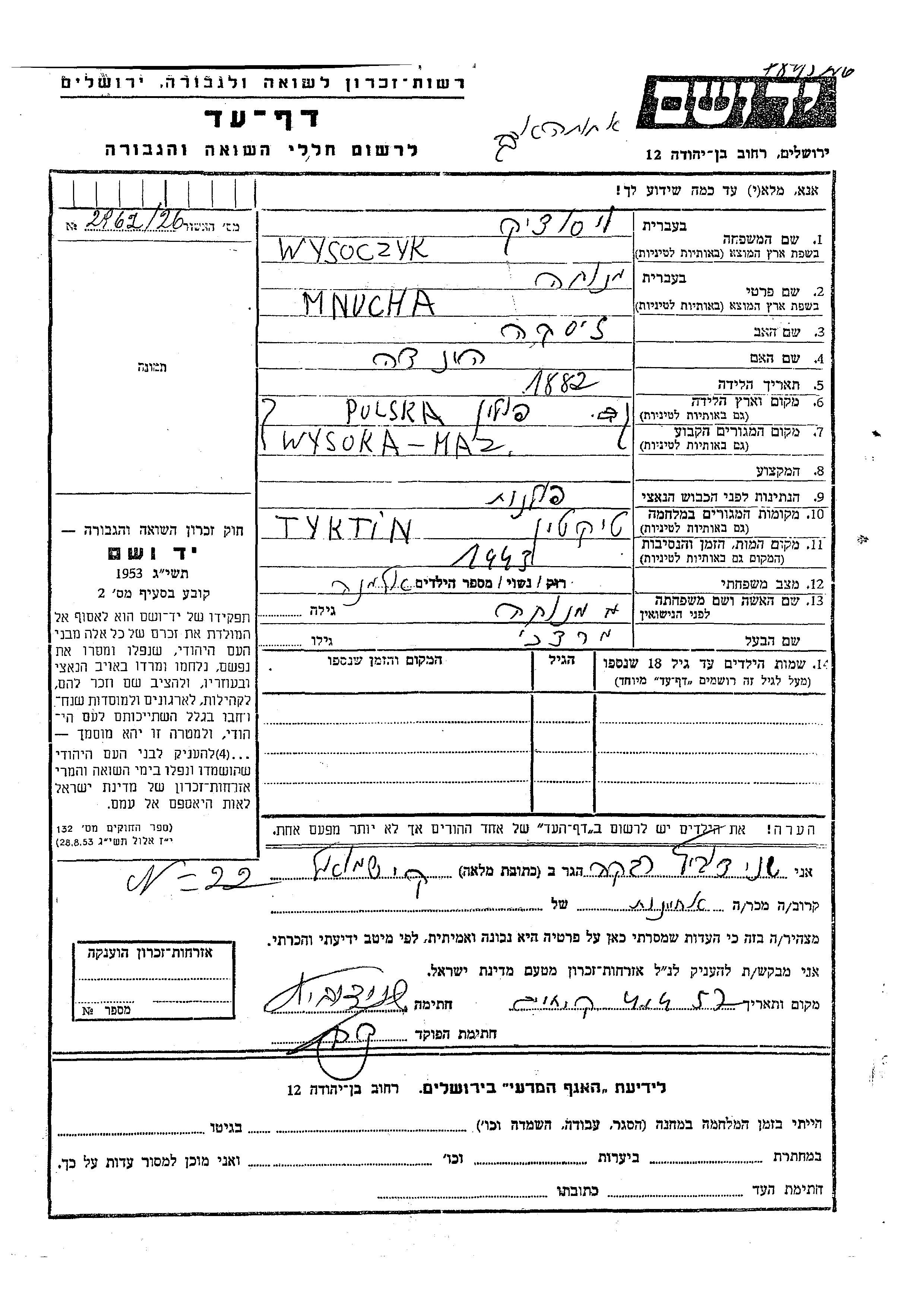 Mnucha Wysoczyk est née à Wysokie Mazowieckie, Pologne en 1882, fille de Ziska et de Hinda. Elle était veuve de Mordekhai. Avant la seconde guerre mondiale elle vivait à Wysokie Mazowieckie, Pologne. Pendant la guerre, elle était à Tiktin, Pologne.
