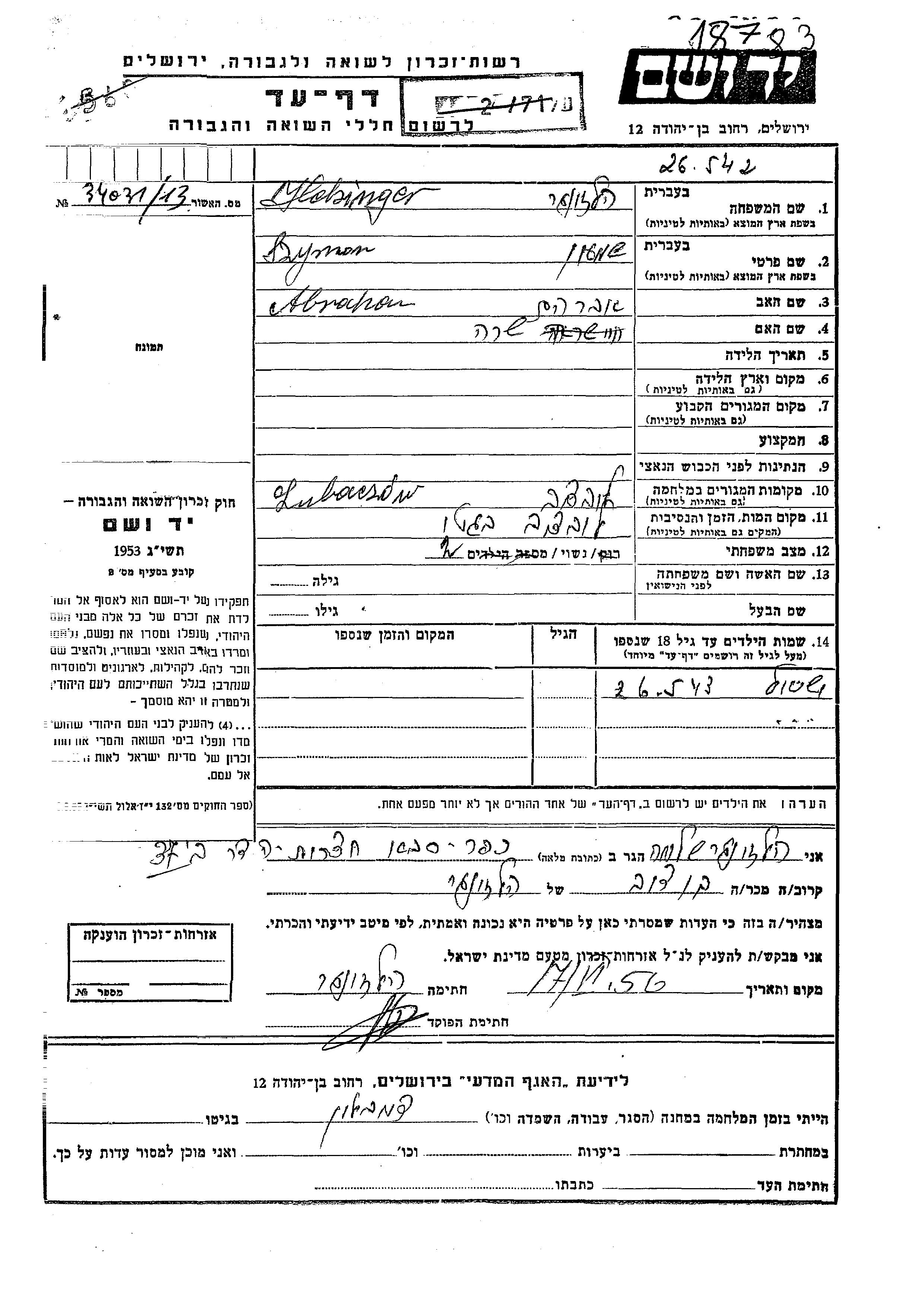 Symon Helsinger est né fils de Abraha et de Sara. Il était Marié. Au cours de la guerre, il était à Lubaczow, Pologne.