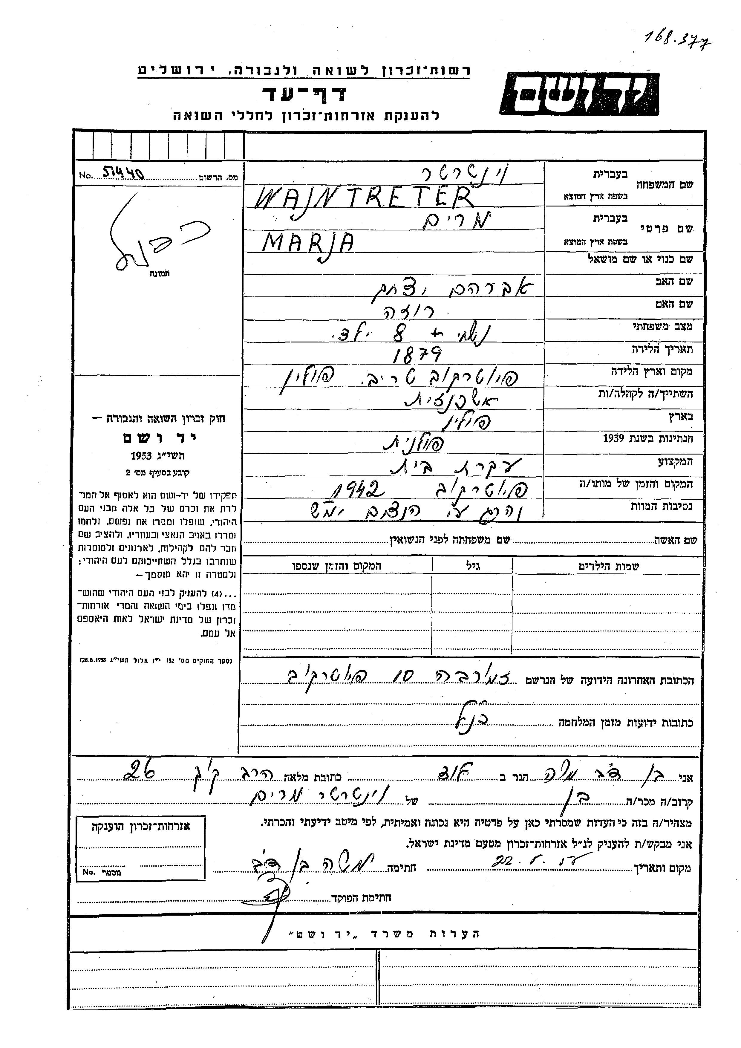 Wajntreter Marja Miriam 1879 Piotrkow Trybunalski, Pologne Feuille de témoignage