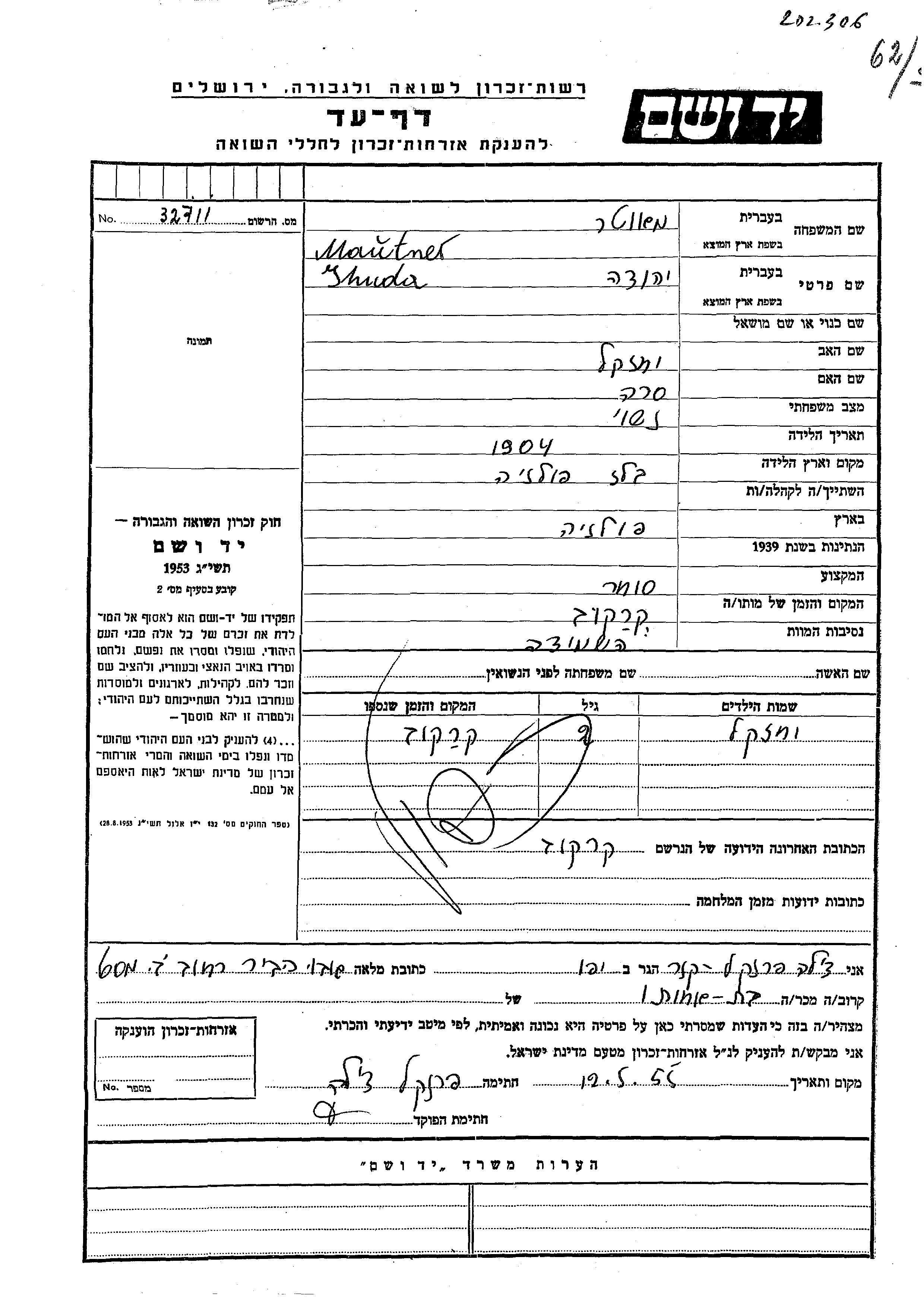 Jhuda Mauther Mautner est né à Belz, Pologne en 1904, fils de Yekhezkel et de Sara. Il était Commerçant/e et Marié. Au cours de la guerre, il était à Krakow, Pologne.