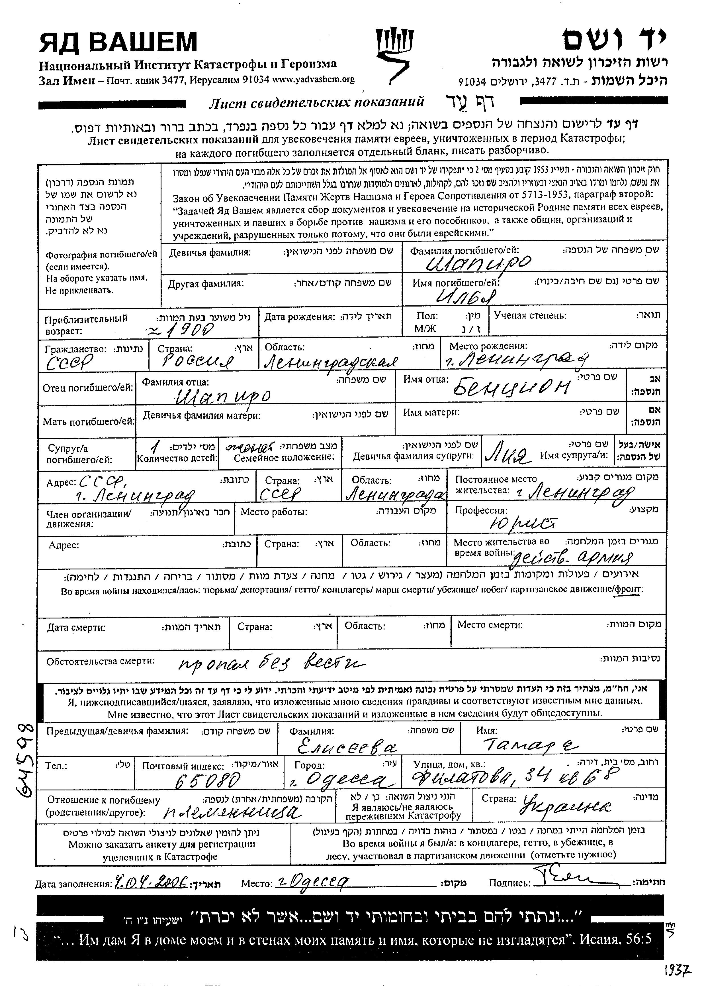 Yad Vashem - Pages of Testimony Names Memorial Collection