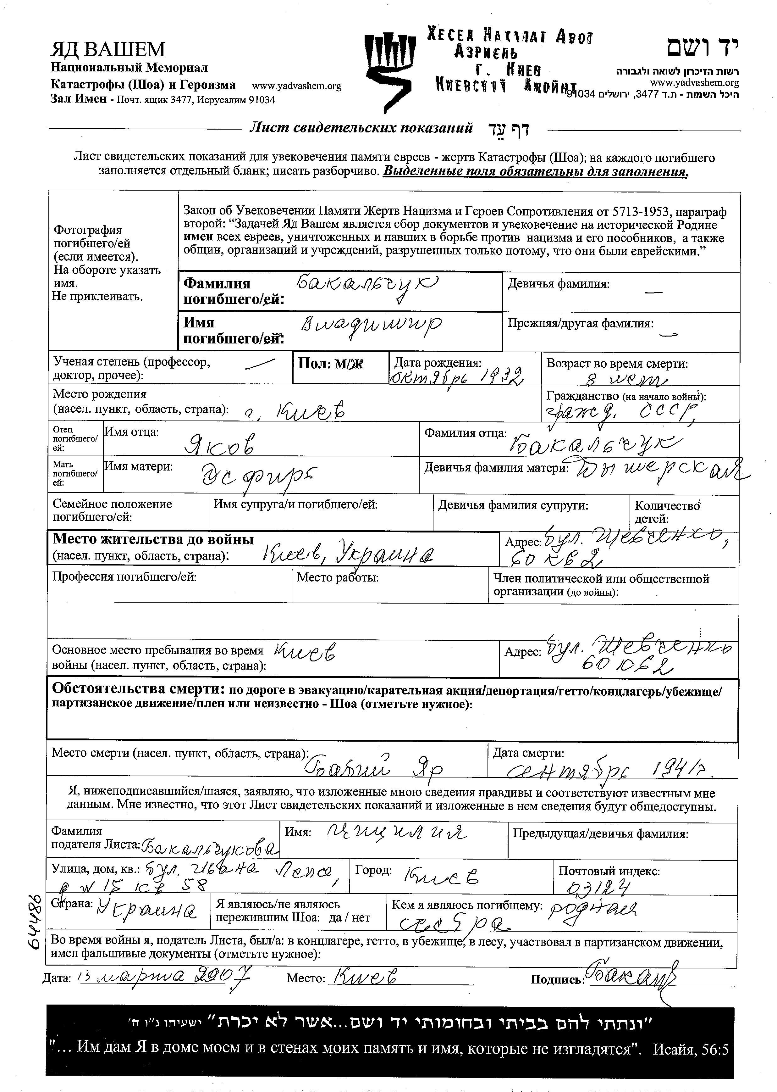 Bakalchuk Vladimir 1932 Kiev, Ukraine (URSS) Feuille de témoignage