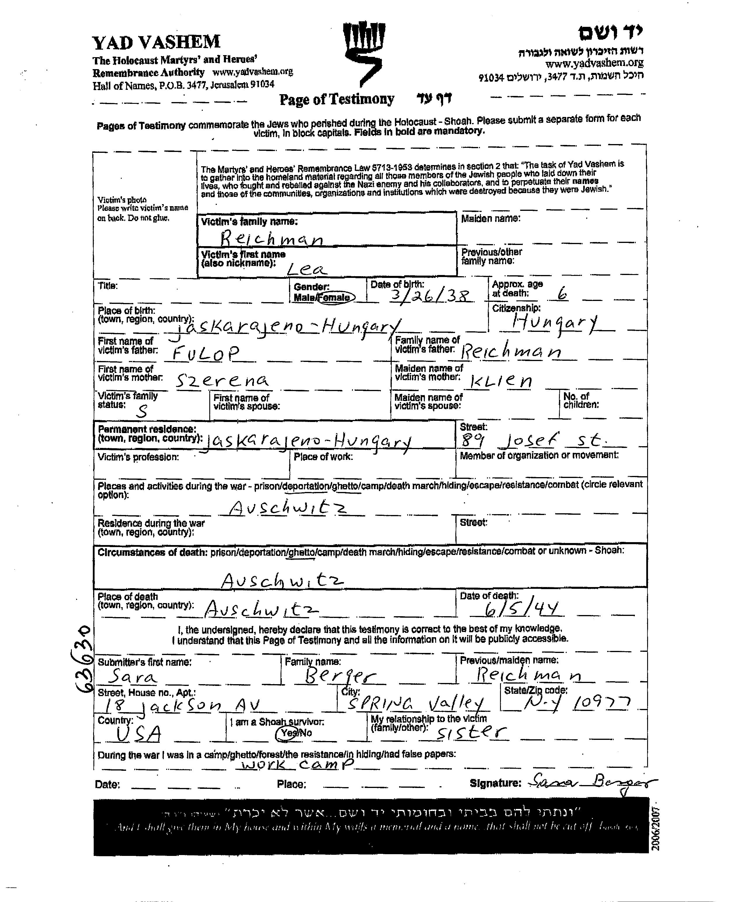 Lea Reichman est née à Jaszkarajeno, Hongrie en 1938, fille de Fulop et de Szerena née Klien. Avant la seconde guerre mondiale elle vivait à Jaszkarajeno, Hongrie.