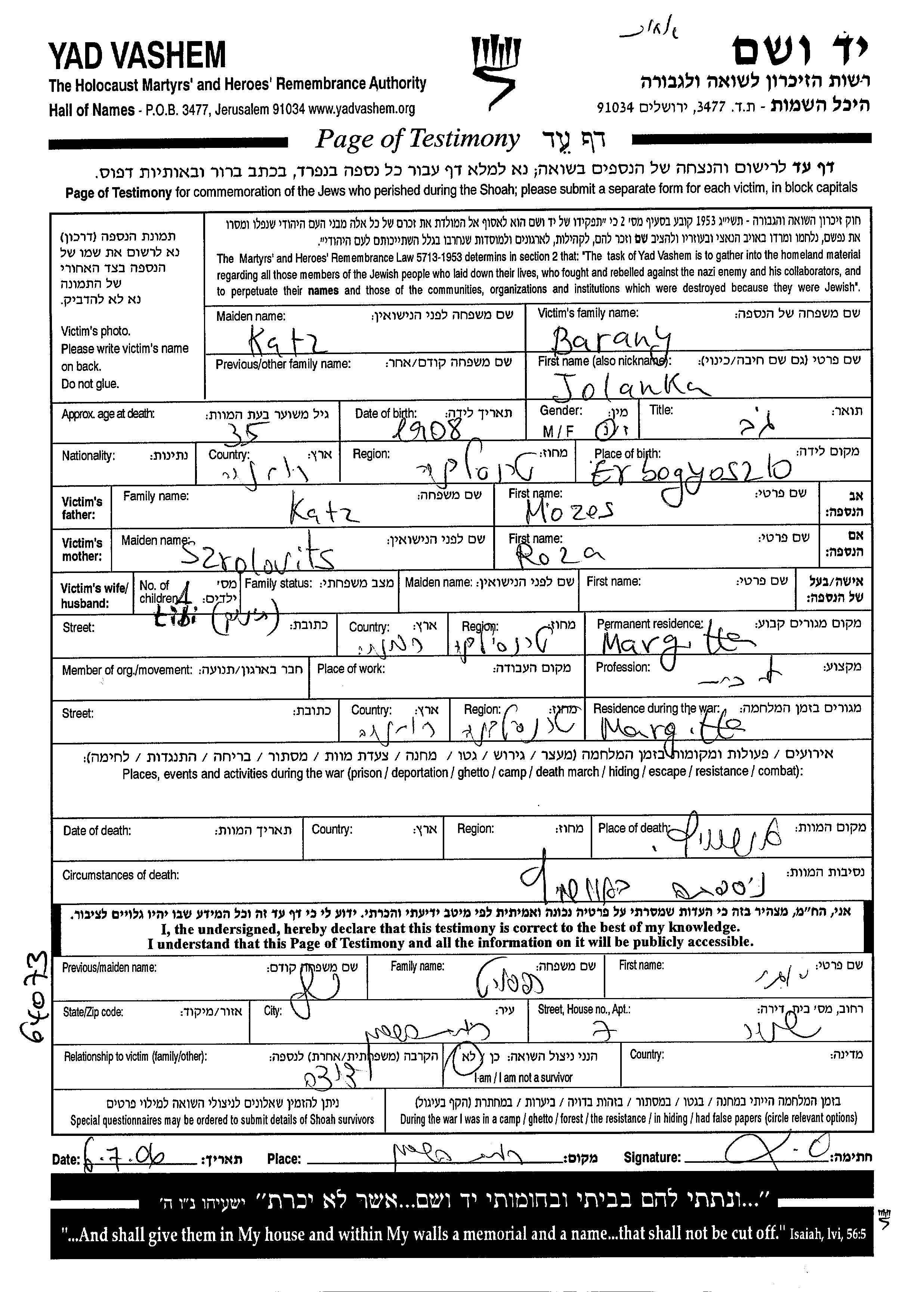 Jolanka Barany née Katz est née à Erbogyoszlo, Roumanie en 1908, fille de Mozes et de Roza née Szrolowits. Elle était Femme au foyer. Avant la seconde guerre mondiale elle vivait à Margitta, Roumanie. Pendant la guerre, elle était à Margitta, Roumanie.