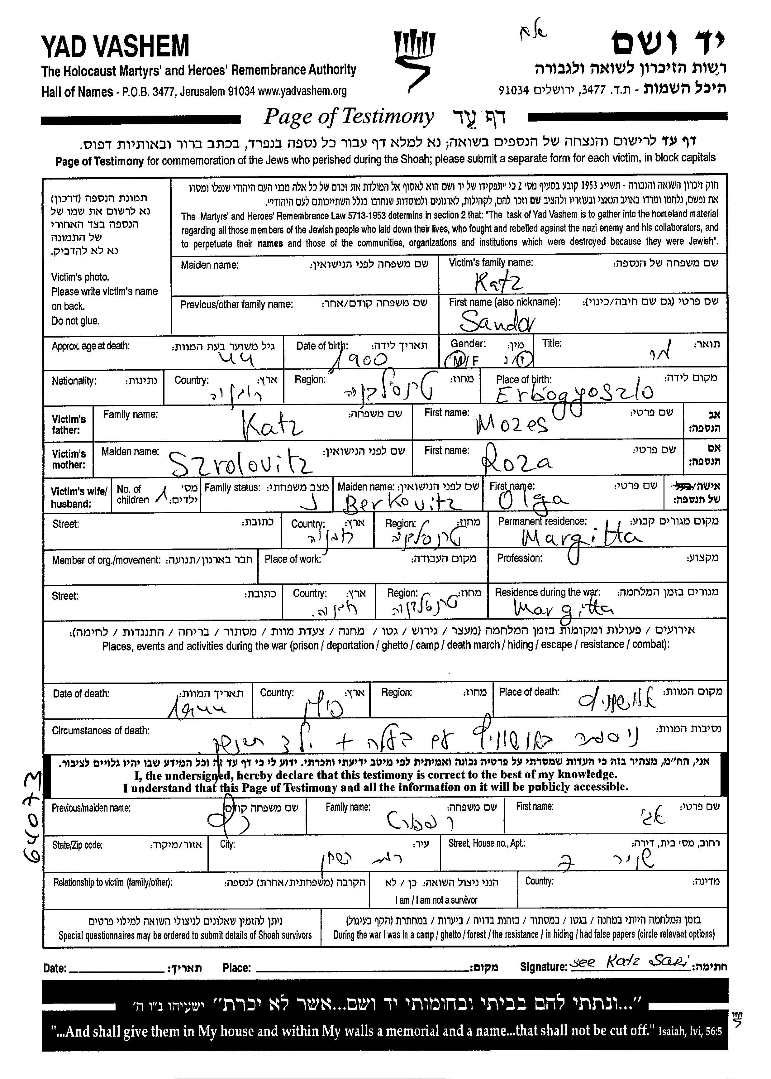 Sandor Katz est né à Erbogyoszlo, Roumanie en 1900, fils de Mozes et de Roza née Szrolovitz. Il était Mariée à Olga née Berkovitz. Avant la seconde guerre mondiale il vivait à Marghita, Roumanie. Au cours de la guerre, il était à Marghita, Roumanie.