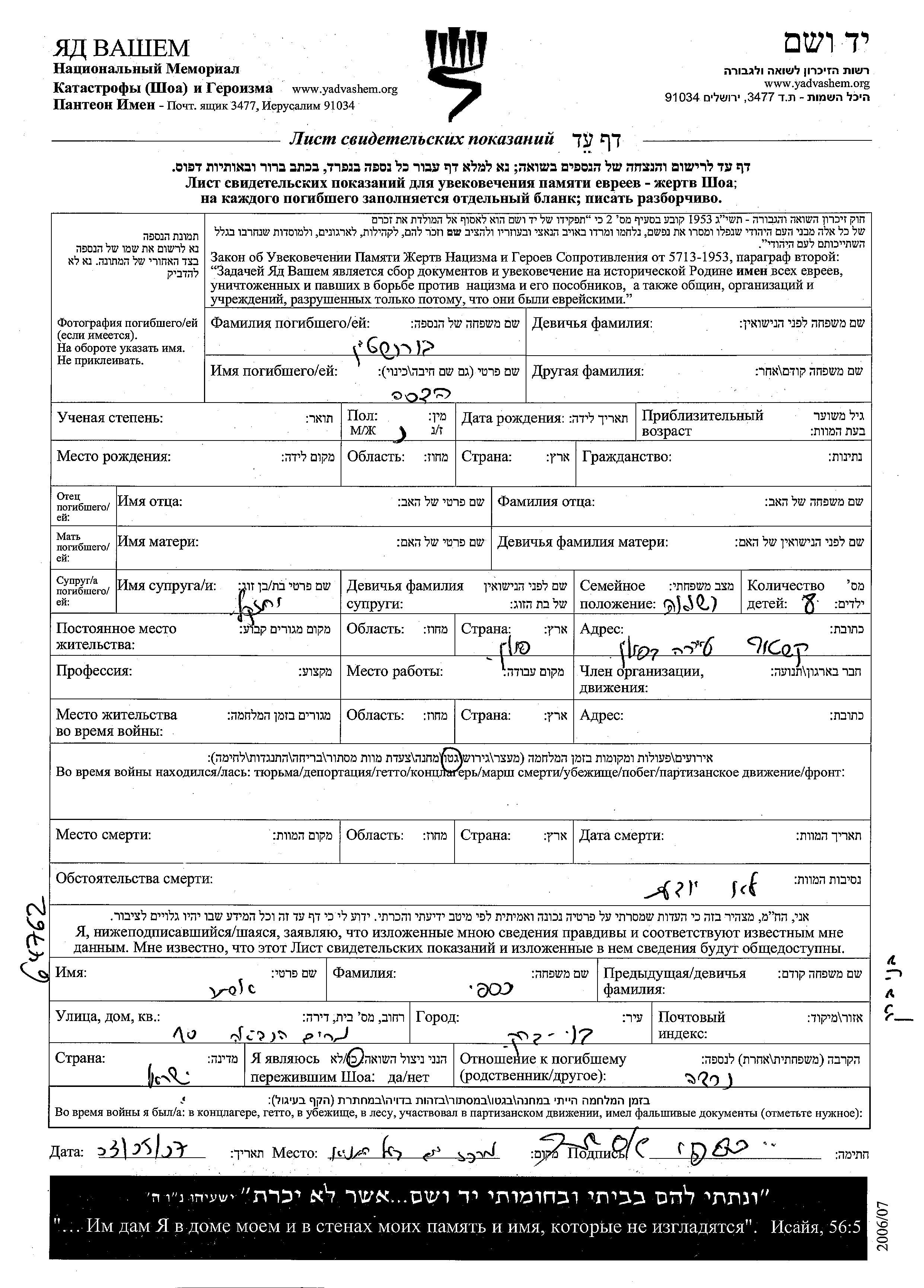Yad Vashem - Pages of Testimony Names Memorial Collection