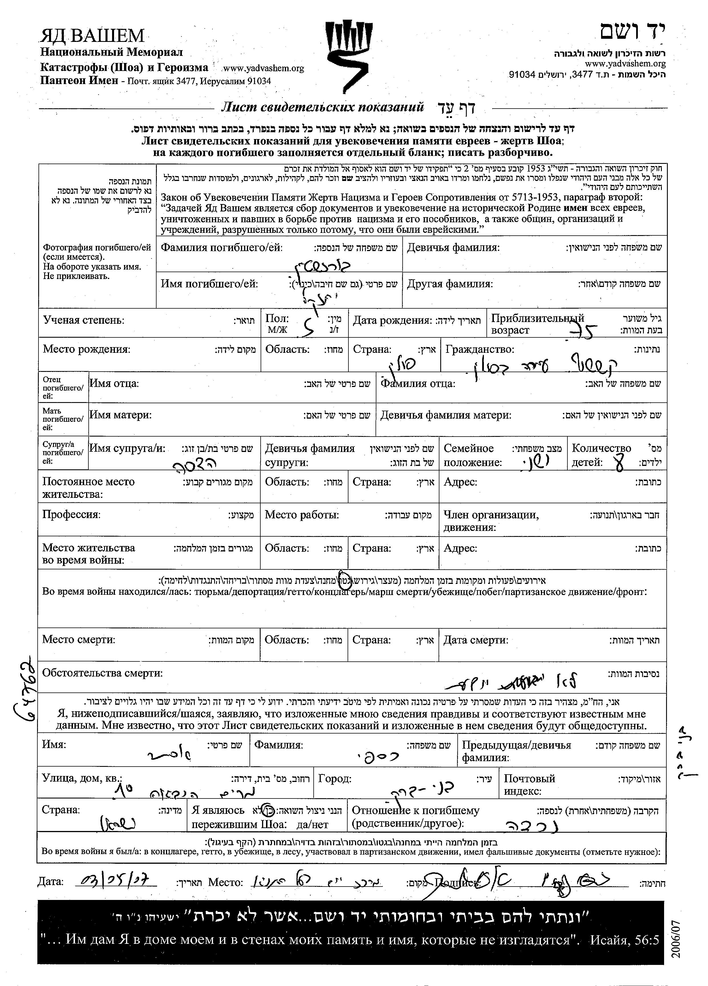 Bornshtein Yekhezkel endroit inconnu, Feuille de témoignage