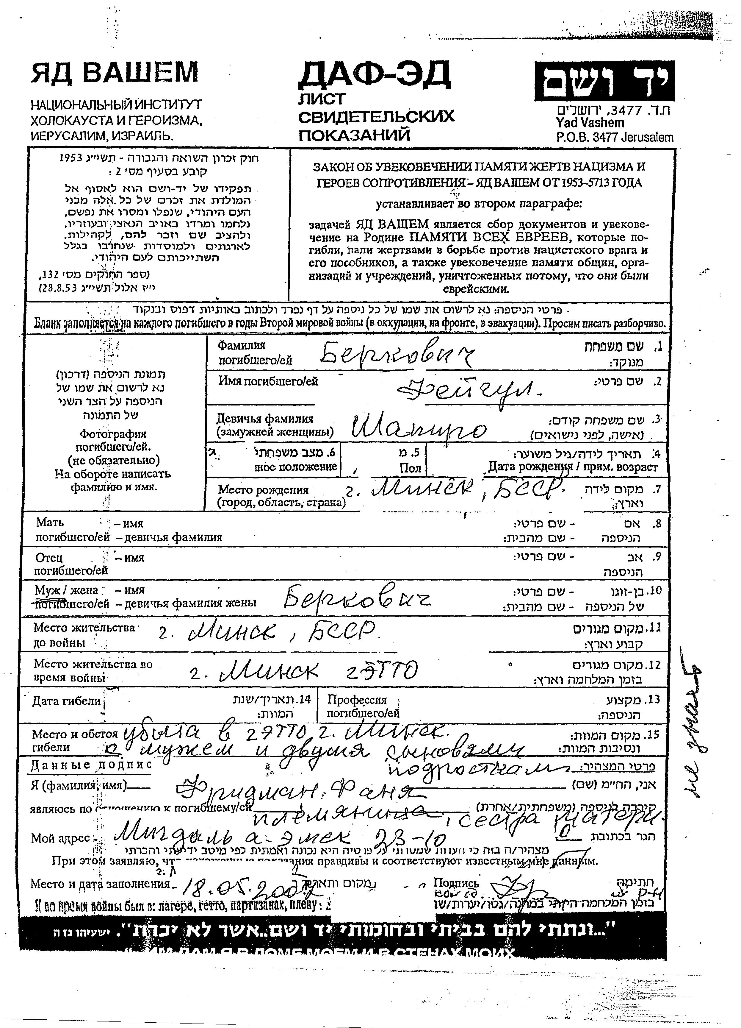Feigul Berkovich née Shapiro est née à Minsk, Bélorussie (URSS). Elle était Mariée. Avant la seconde guerre mondiale elle vivait à Minsk, Bélorussie (URSS). Pendant la guerre, elle était à Minsk, Bélorussie (URSS).
