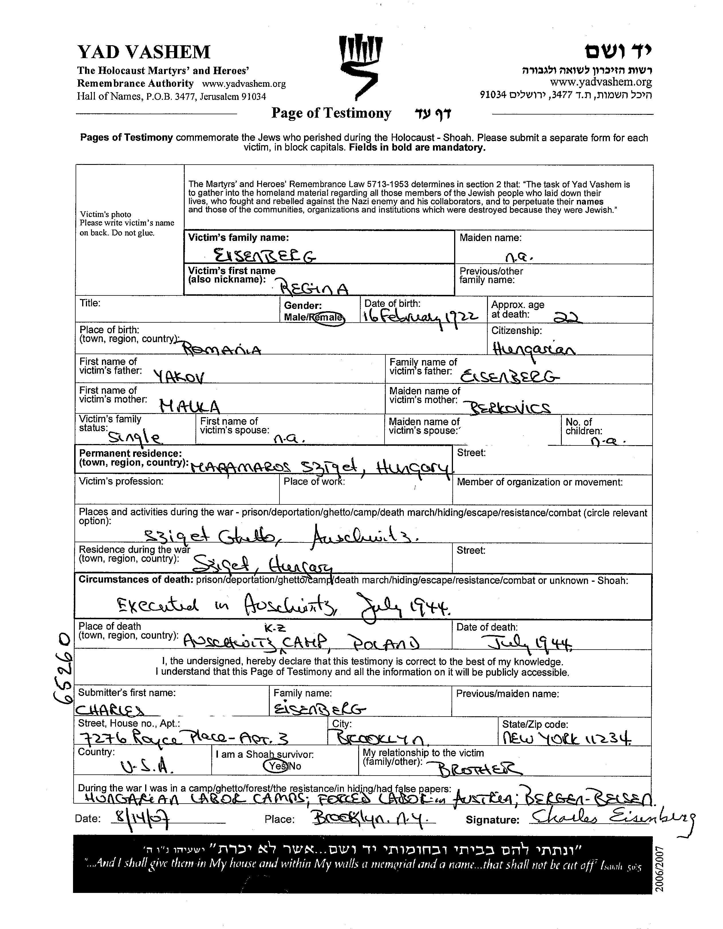 Regina Eisenberg est née à Roumanie en 1922, fille de Yakov et de Malka née Berkovics. Elle était Célibataire. Avant la seconde guerre mondiale elle vivait à Sziget, Roumanie. Pendant la guerre, elle était à Sighet, Roumanie.
