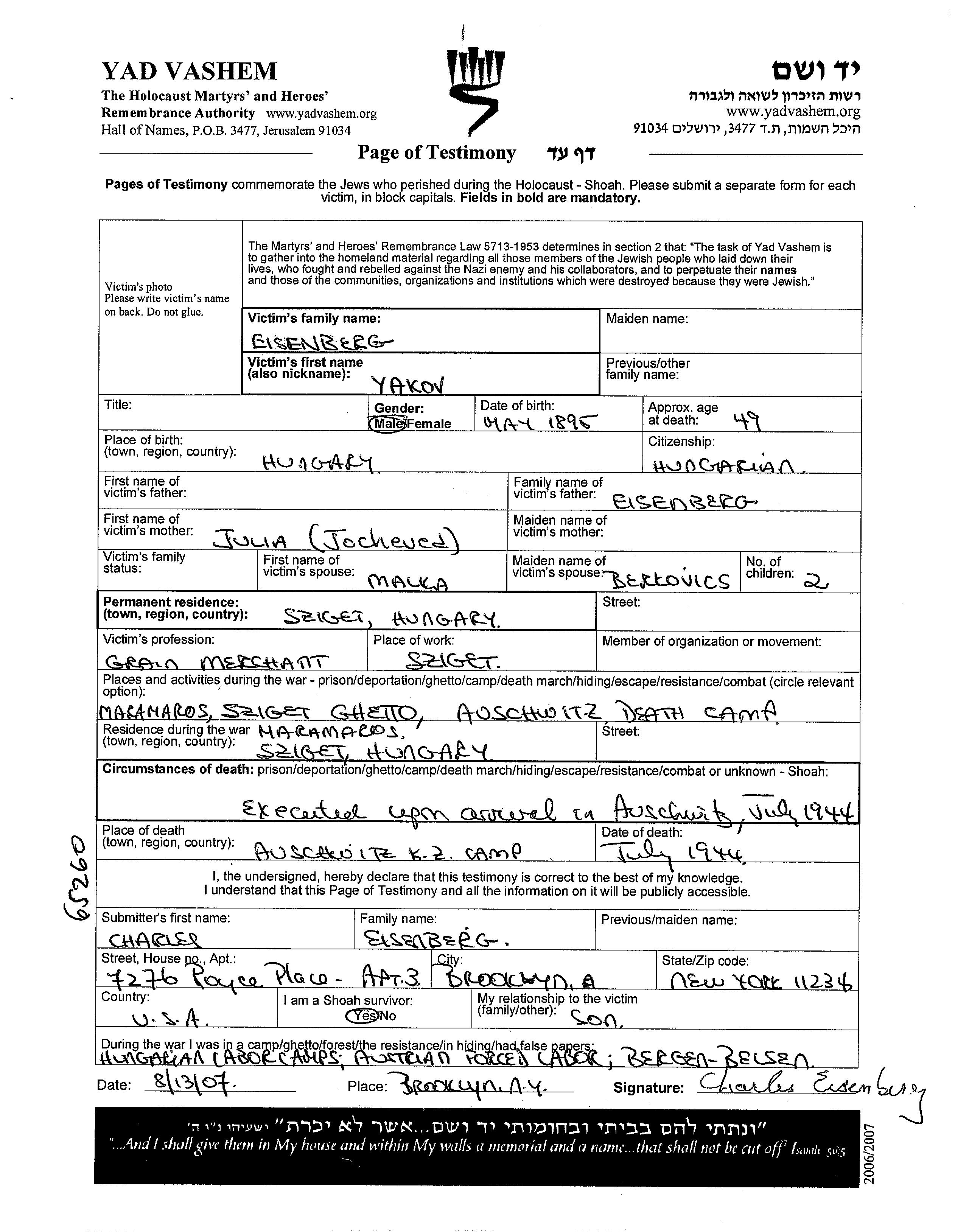 Yakov Eisenberg est né à Hongrie en 1895, fils de Julia Jocheved. Il était Négociant en grain et Mariée à Malka née Berkovics. Avant la seconde guerre mondiale il vivait à Sziget, Roumanie. Au cours de la guerre, il était à Sziget, Roumanie.