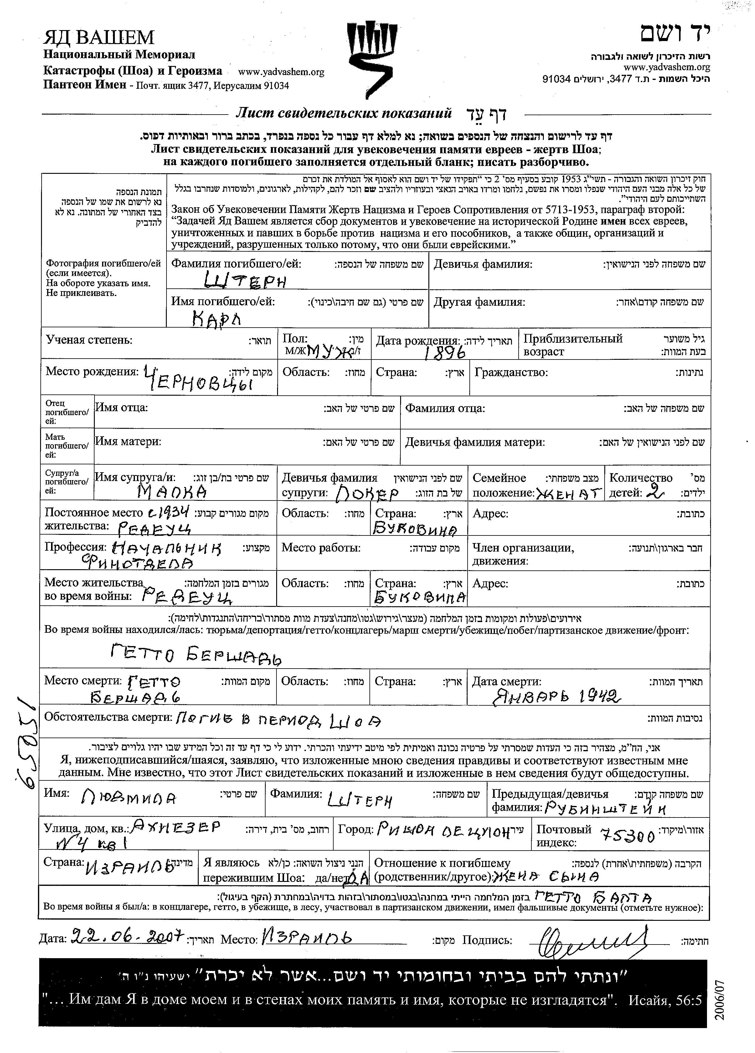 Yad Vashem - Pages of Testimony Names Memorial Collection