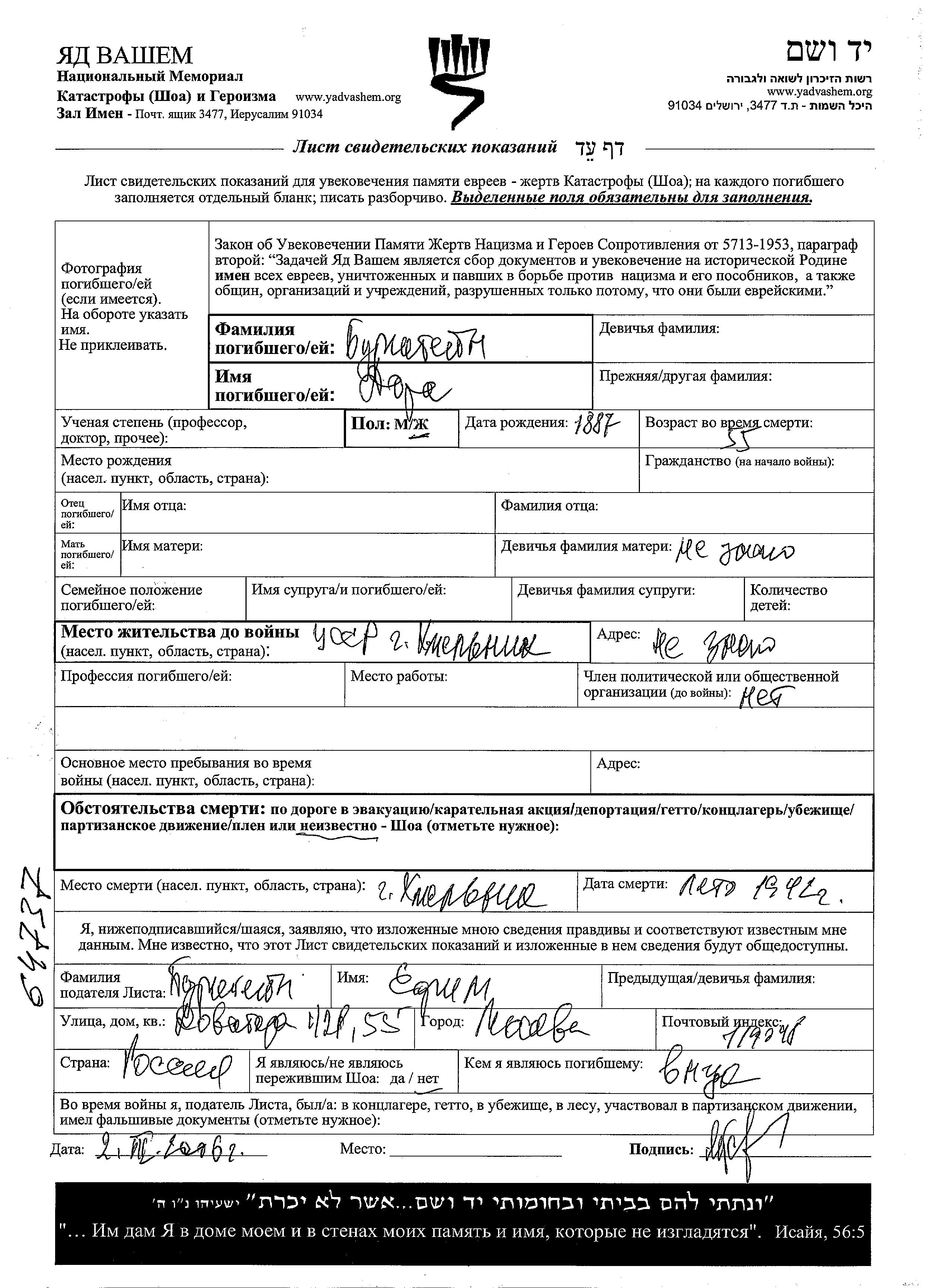 Burshteyn Dora 1887 Khmelnik, Ukraine (URSS) Feuille de témoignage