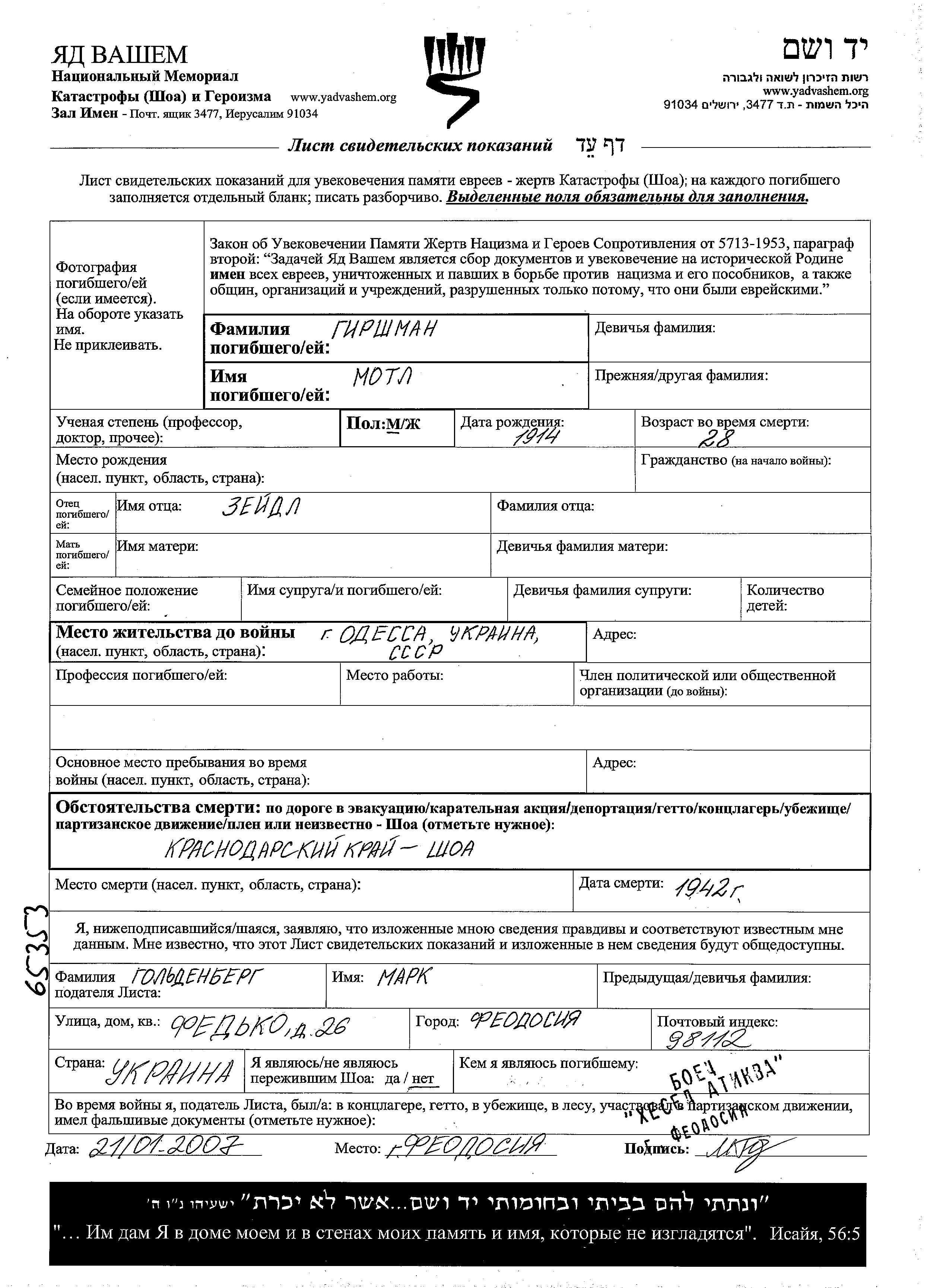 Girshman Motl 1914 Odessa, Ukraine (URSS) Feuille de témoignage