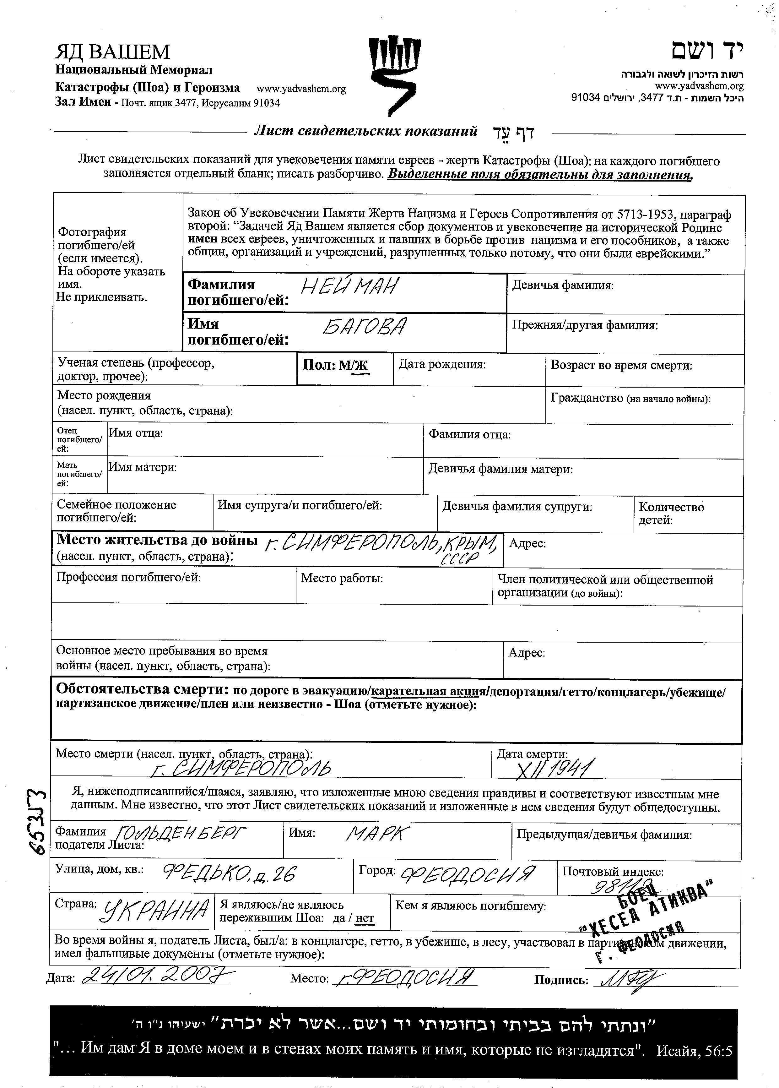 Neiman prénom inconnu Simferopol, Russie (URSS) Feuille de témoignage