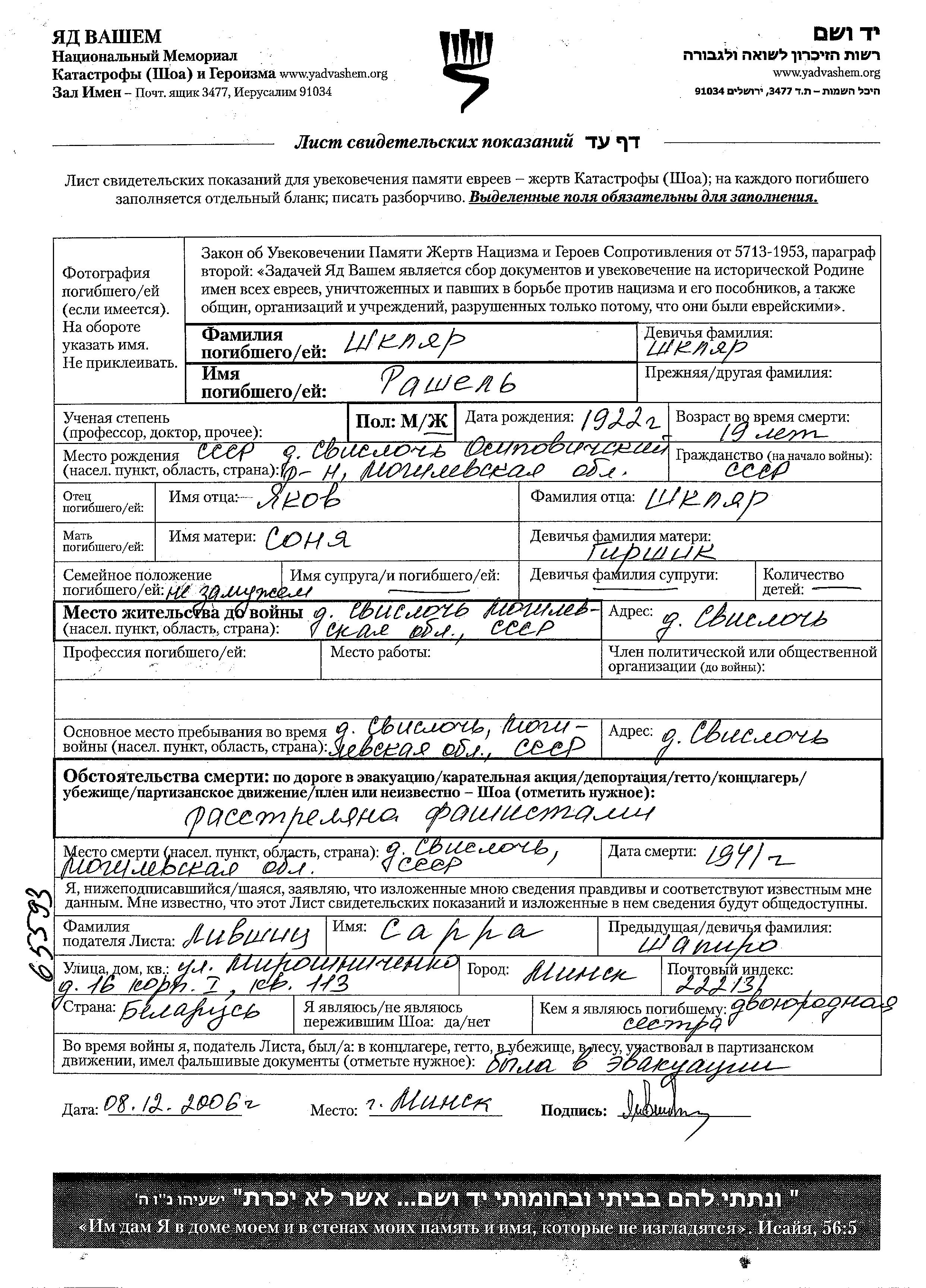 Shklyar Rashel 1922 Svisloch, Bélorussie (URSS) Feuille de témoignage