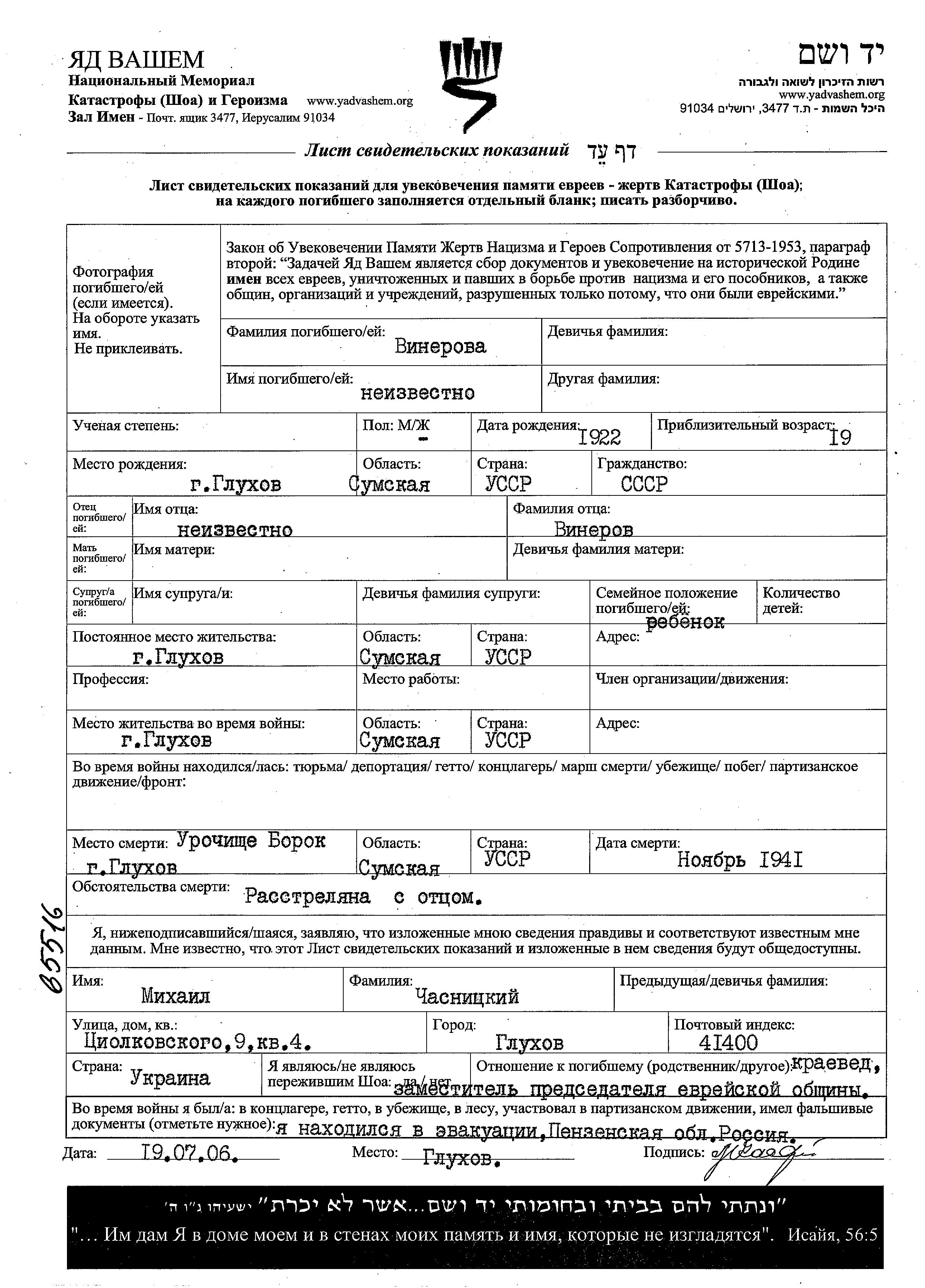 Vinerova prénom inconnu 1922 Glukhov, Ukraine (URSS) Feuille de témoignage