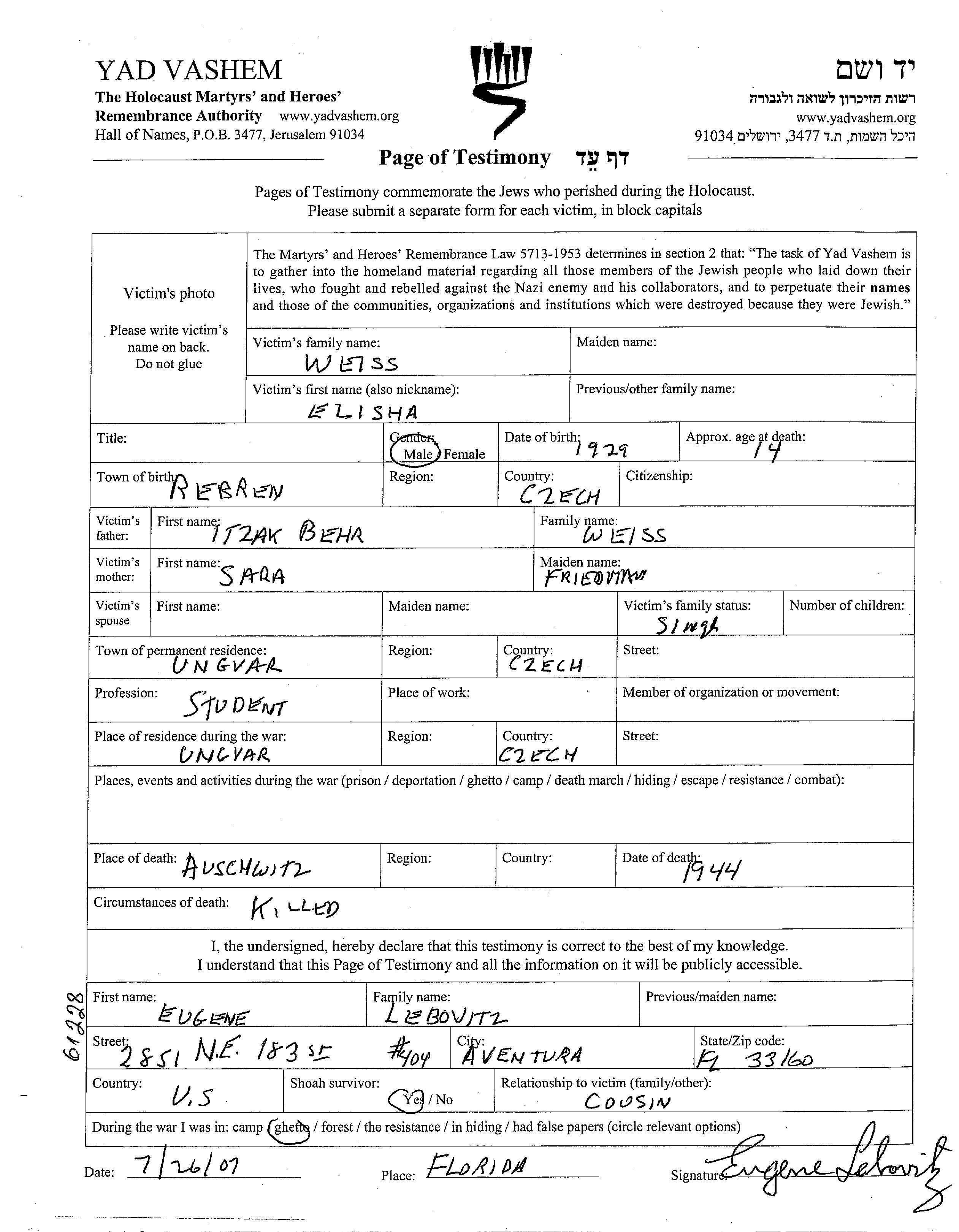 Weiss Elisha 1929 Ungvar, Tchécoslovaquie Feuille de témoignage