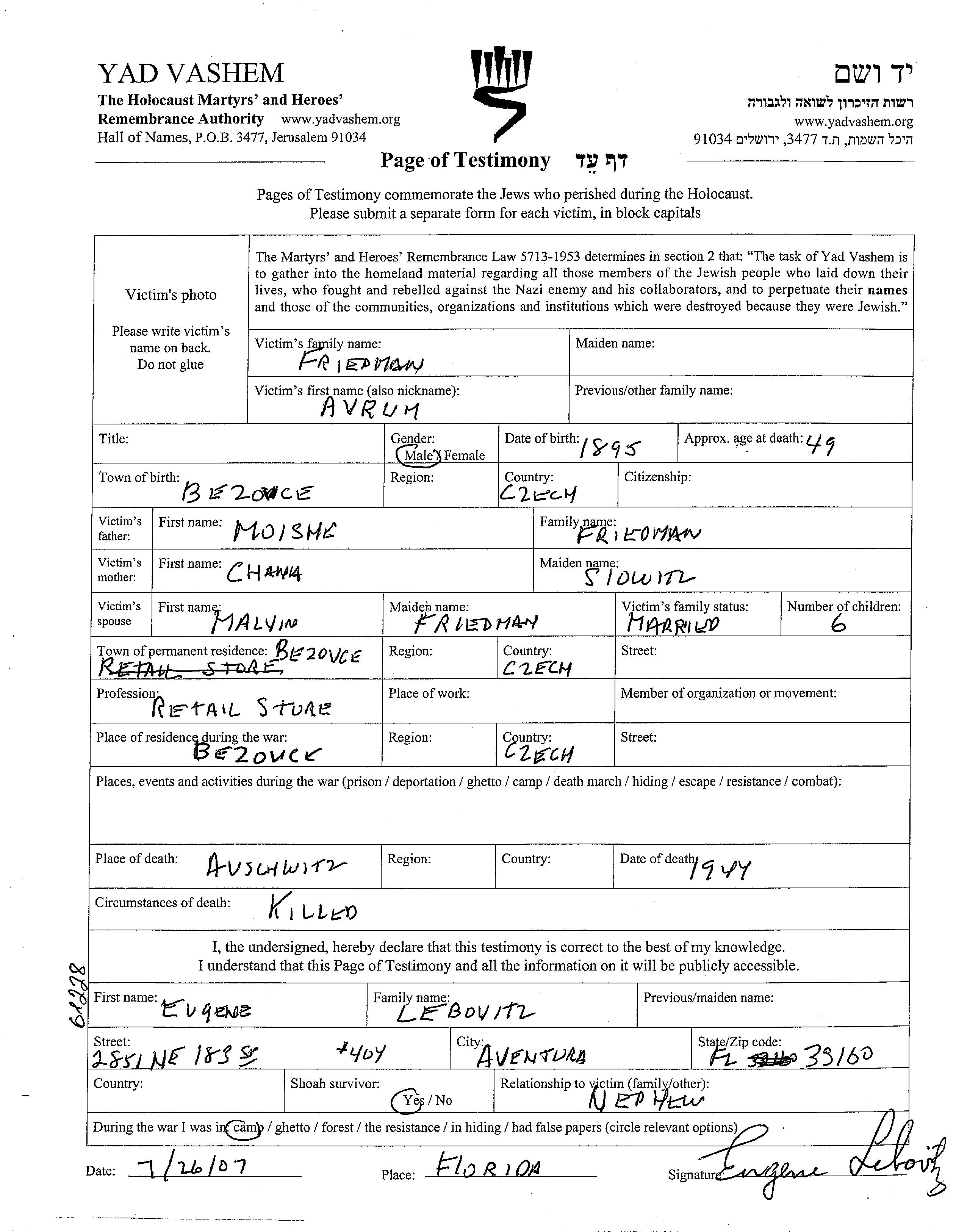 Friedman Avrum 1895 Bezovce, Tchécoslovaquie Feuille de témoignage