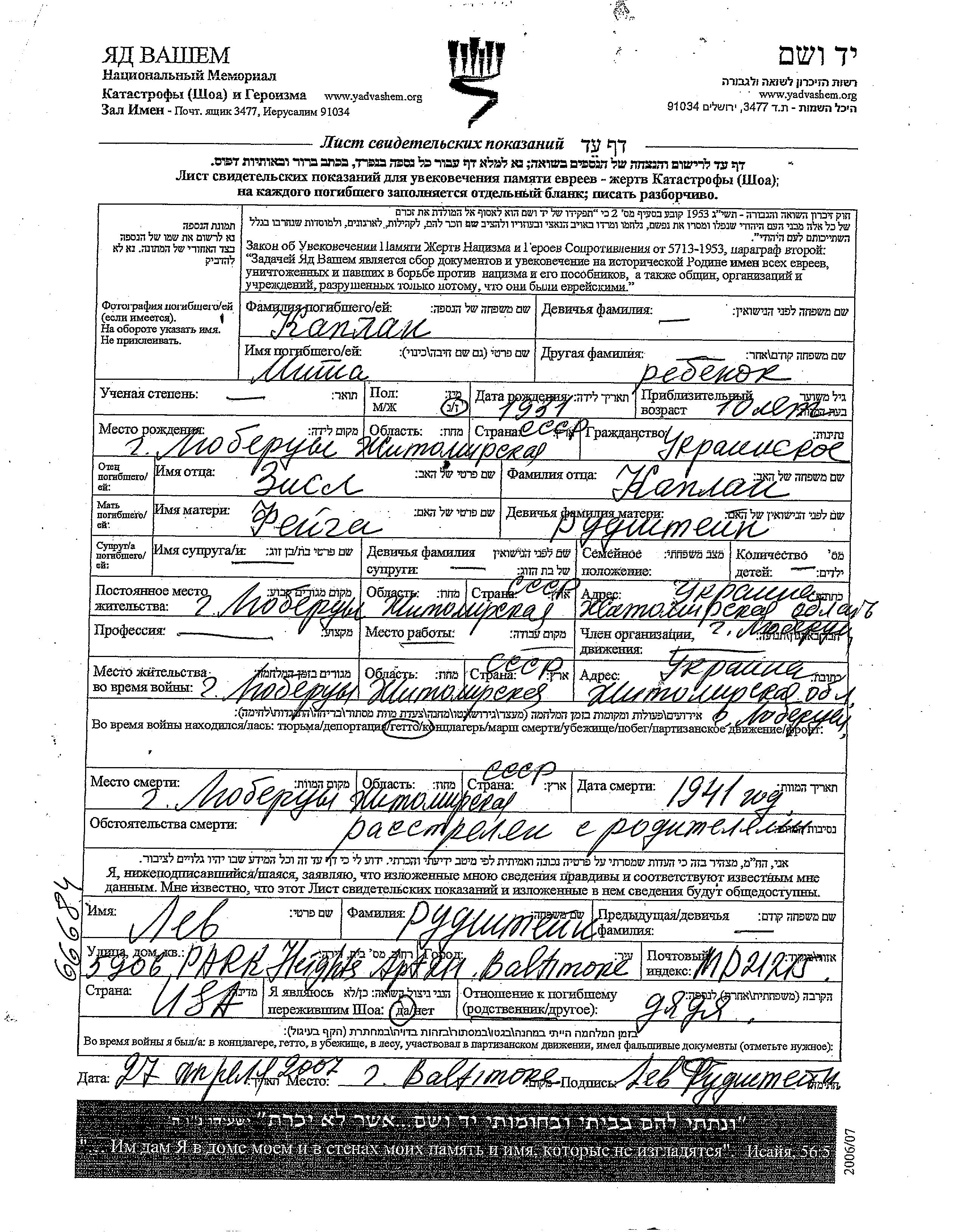 Yad Vashem - Pages of Testimony Names Memorial Collection