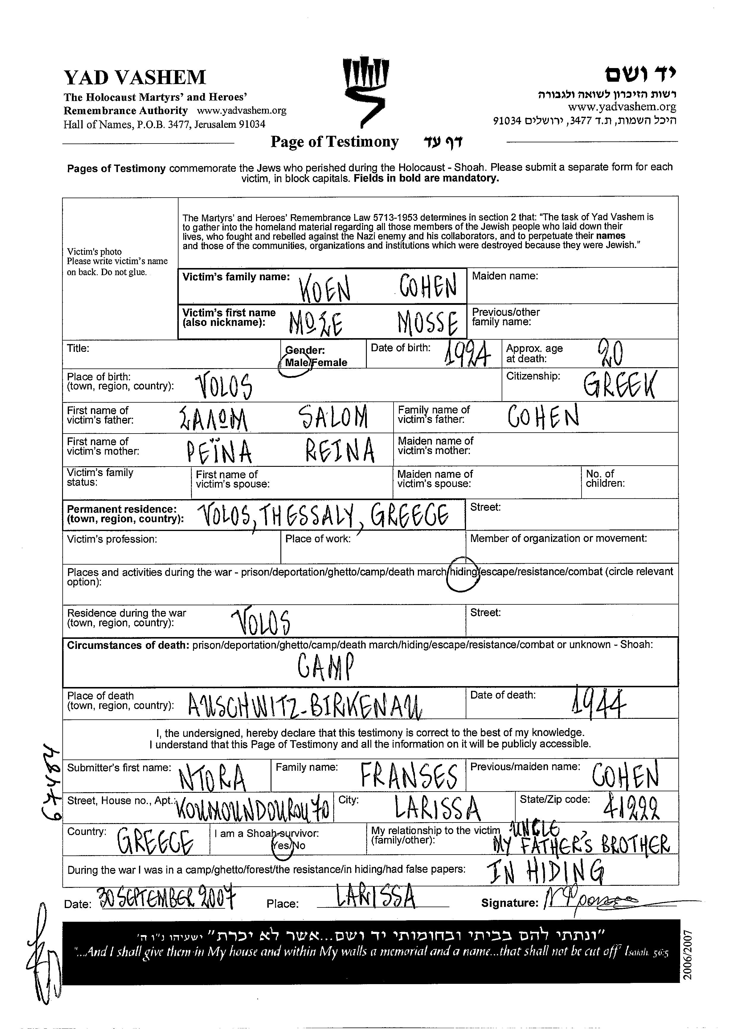 Mosse Cohen est né à Volos, Grèce en 1924, fils de Salom et de Reina. Il était Célibataire. Avant la seconde guerre mondiale il vivait à Volos, Grèce.
