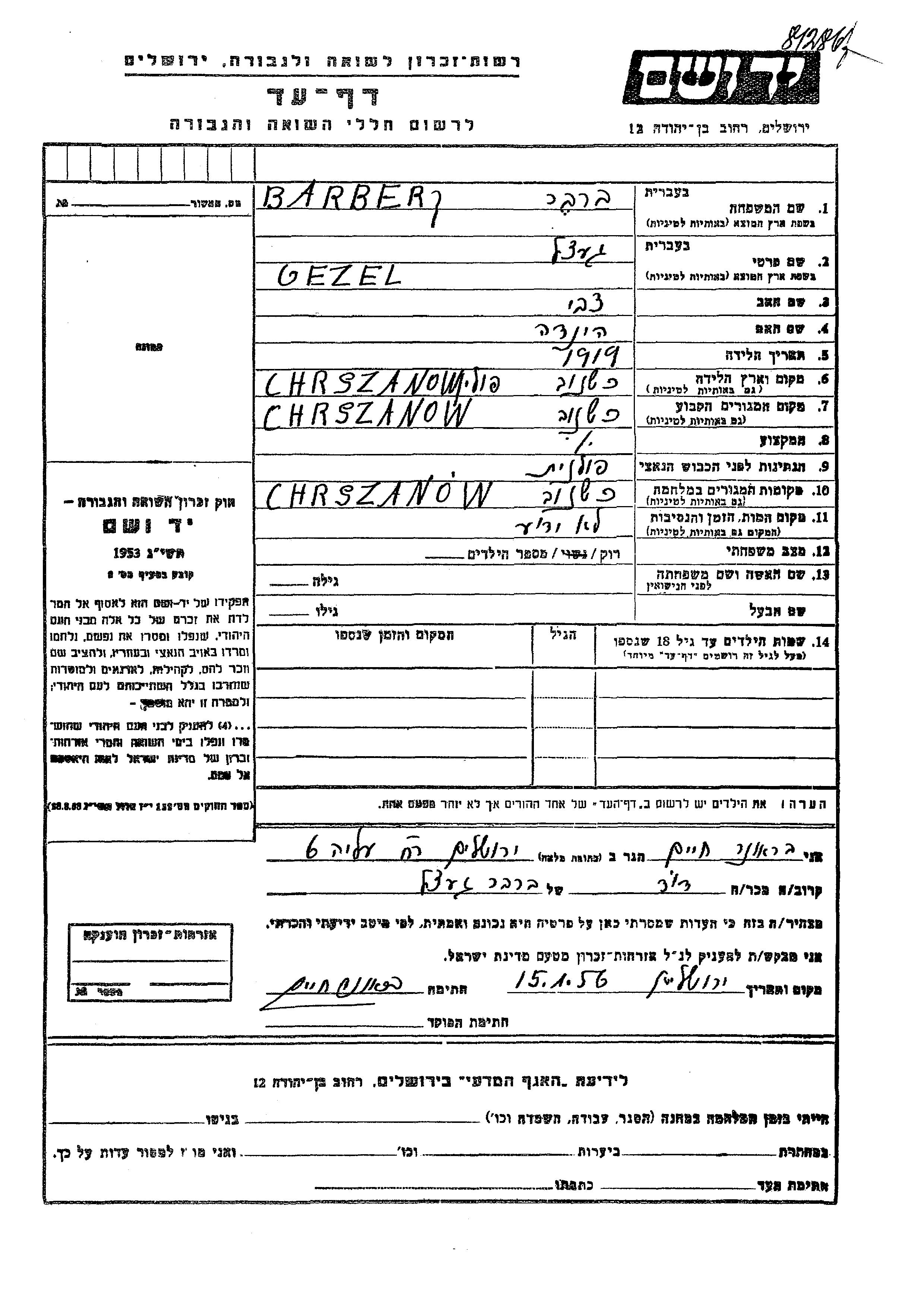 Gezel Barber est né à Chrszanow, Pologne en 1919, fils de Tzvi et de Hinda. Il était Célibataire. Avant la seconde guerre mondiale il vivait à Chrszanow, Pologne. Au cours de la guerre, il était à Chrszanow, Pologne.