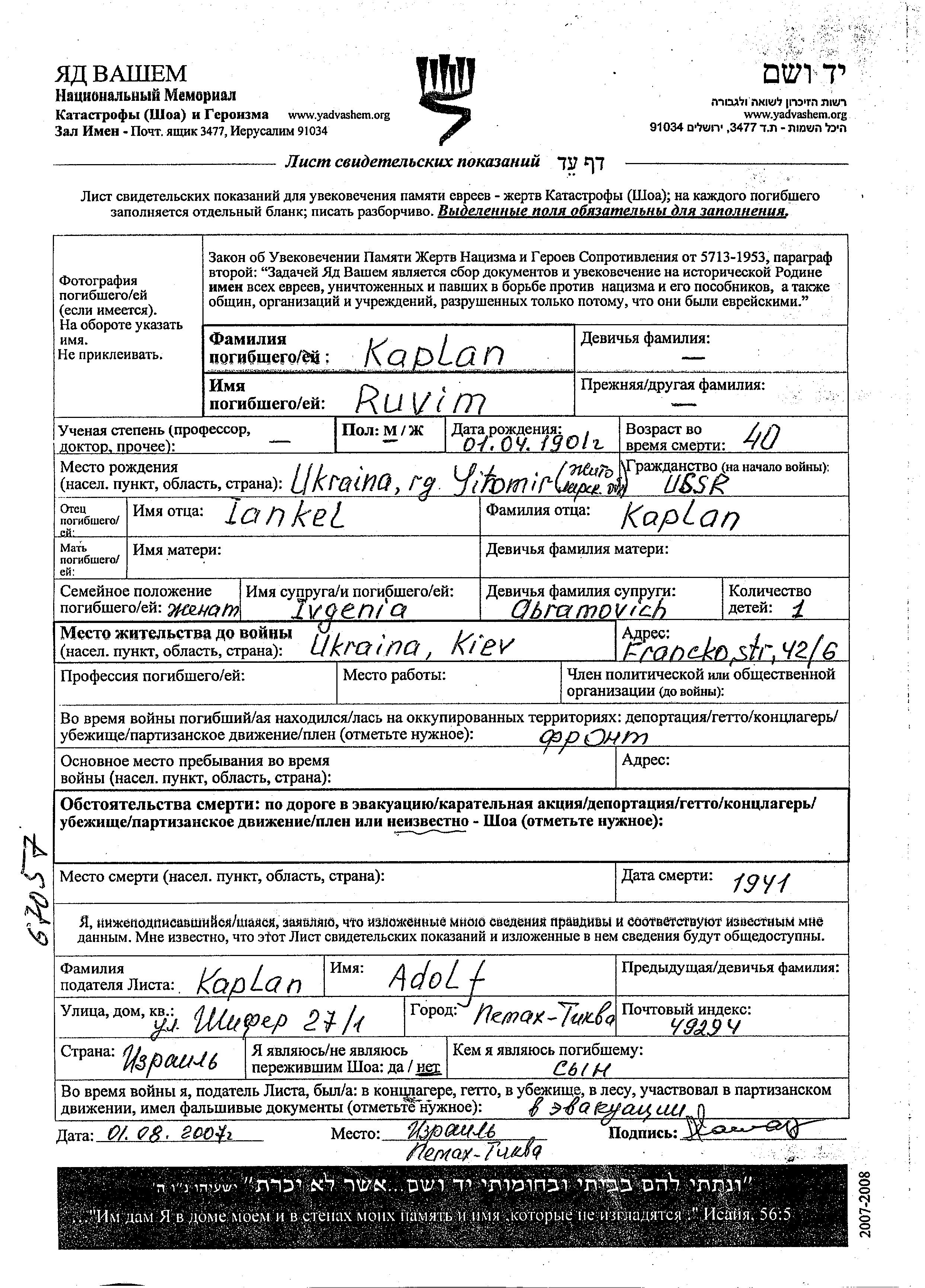 Ruvim Kaplan est né à Zhitomir, Ukraine (URSS) en 1901, fils de Yankel. Il était Mariée à Yevgeniya née Abramovich. Avant la seconde guerre mondiale il vivait à Kiev, Ukraine (URSS). Au cours de la guerre, il était à the Soviet armed forces.
