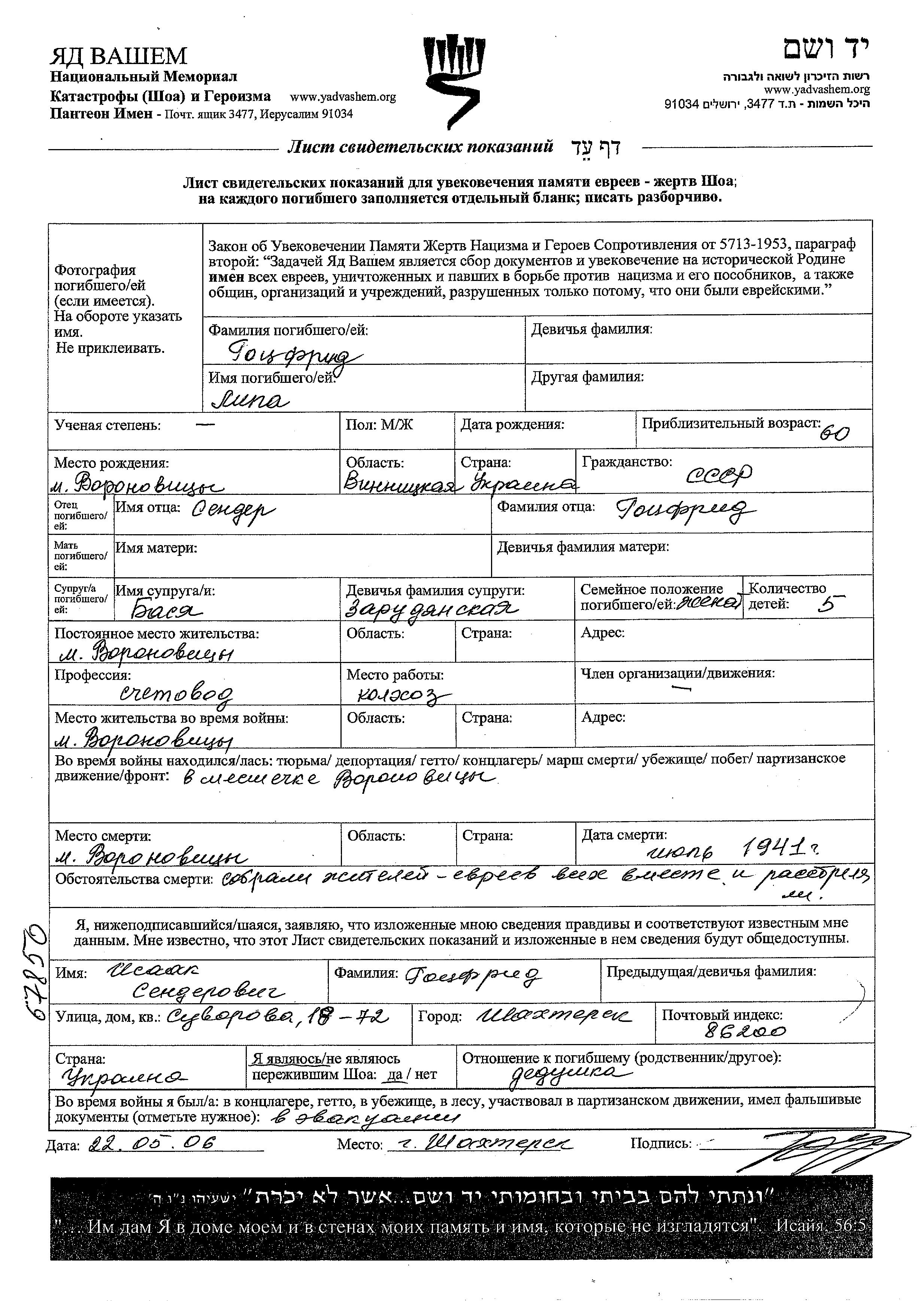 Gotzfrid Lipa Voronovitsa, Ukraine (URSS) Feuille de témoignage