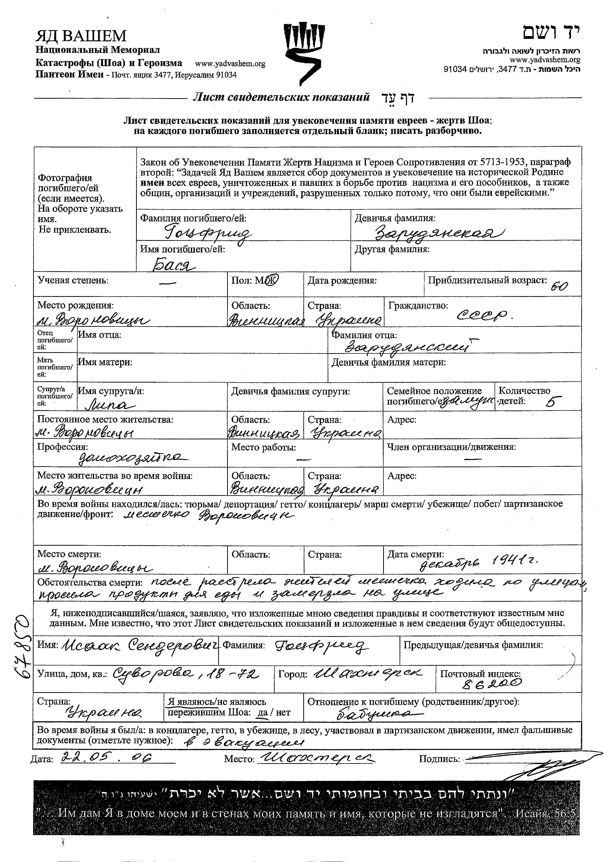 Gotzfrid Basya Voronovitsa, Ukraine (URSS) Feuille de témoignage