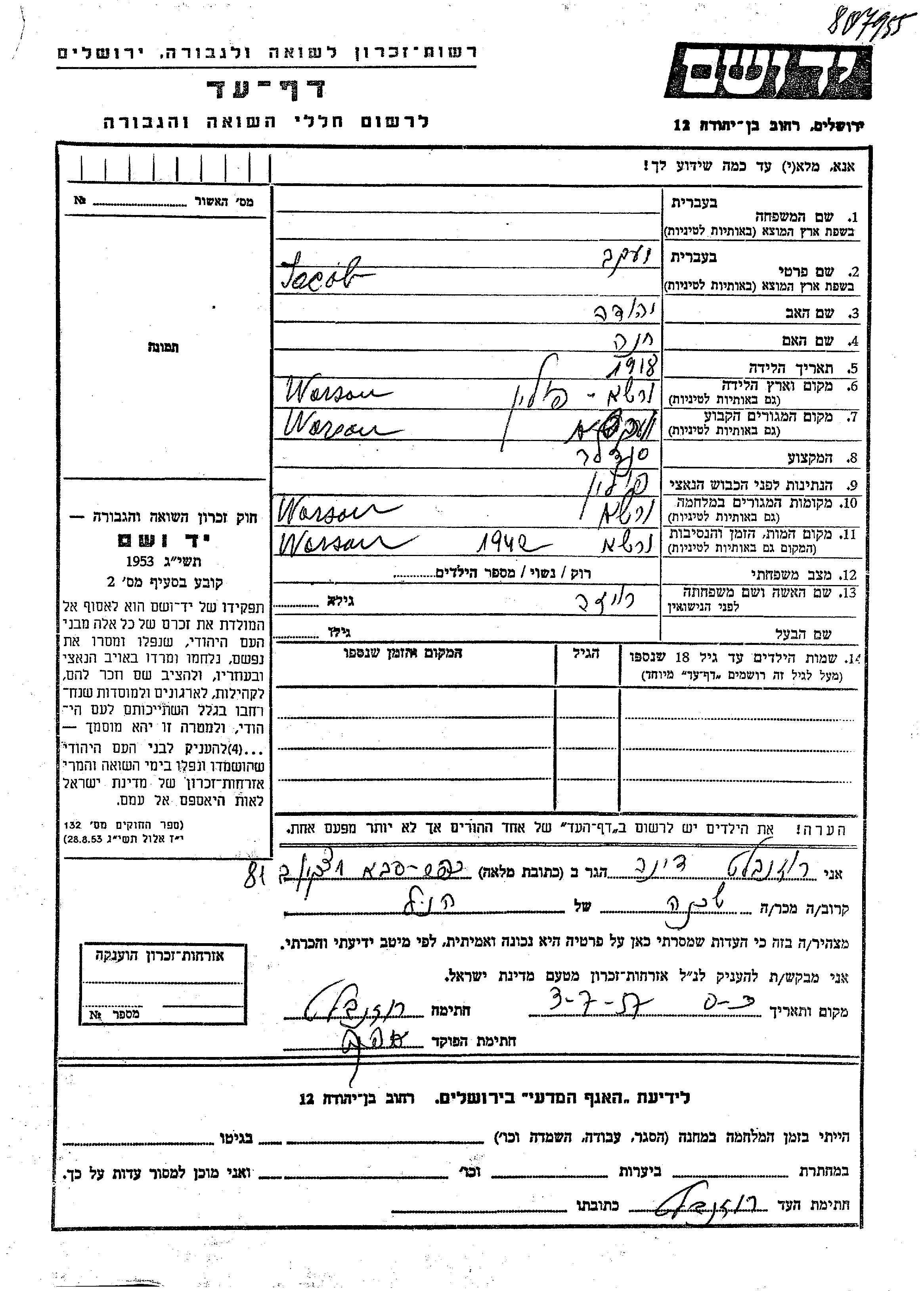 nom inconnu Iacob 1918 Varsha, Pologne Feuille de témoignage