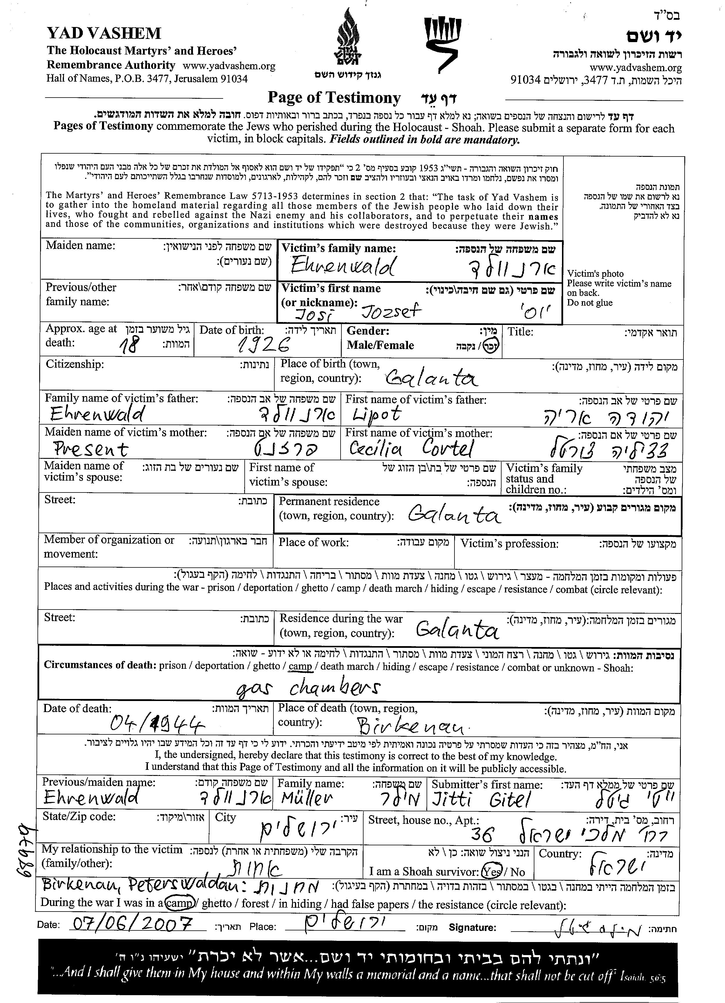 Josi Ehrenwald est né à Galanta, Tchécoslovaquie en 1926, fils de Lipot Yehuda Arie et de Cecilia Cortel née Present. Il était Célibataire. Avant la seconde guerre mondiale il vivait à Galanta, Tchécoslovaquie. Au cours de la guerre, il était à Galanta, Tchécoslovaquie.