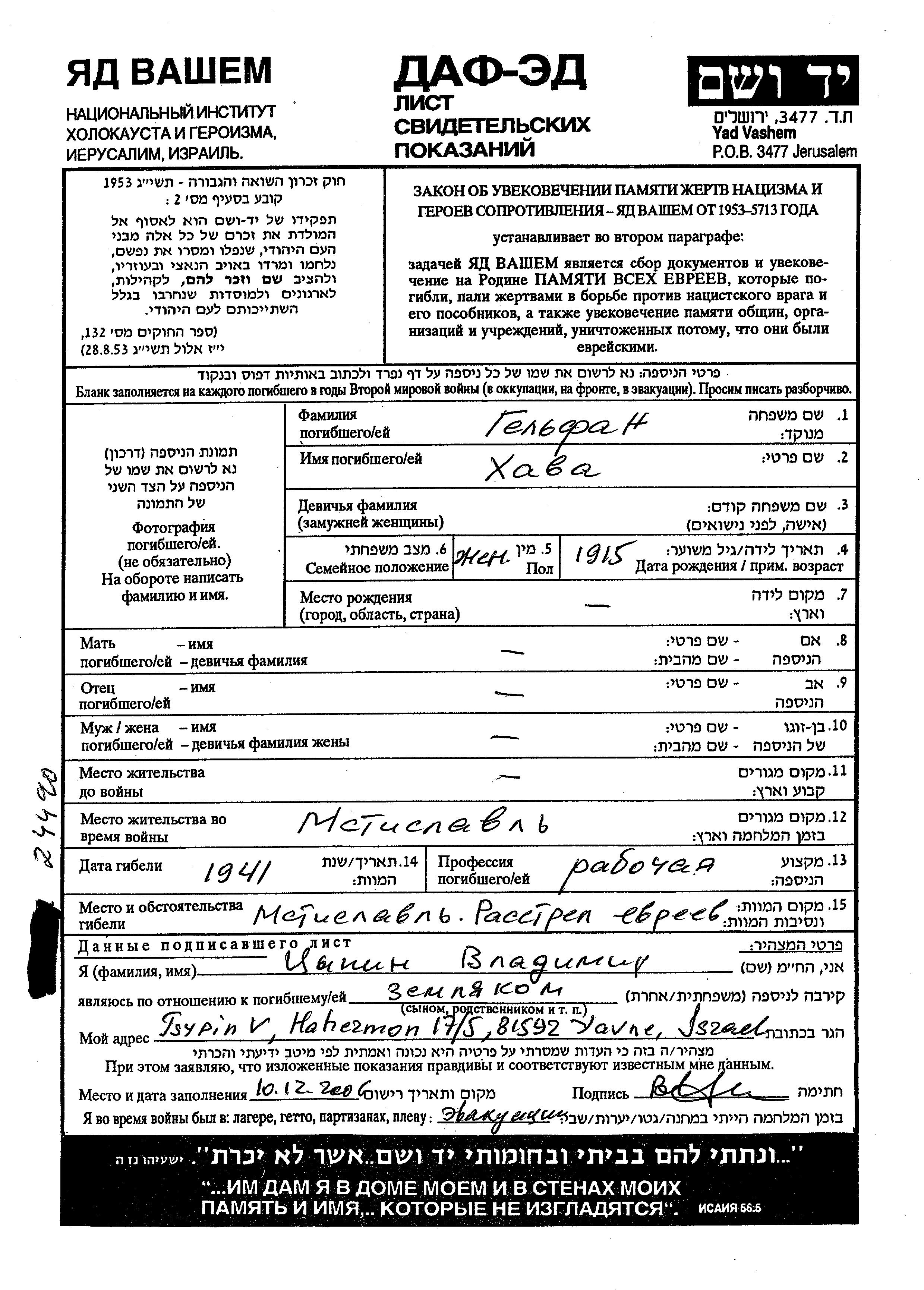 Gelfan Khava 1915 Mstislavl, Bélorussie (URSS) Feuille de témoignage