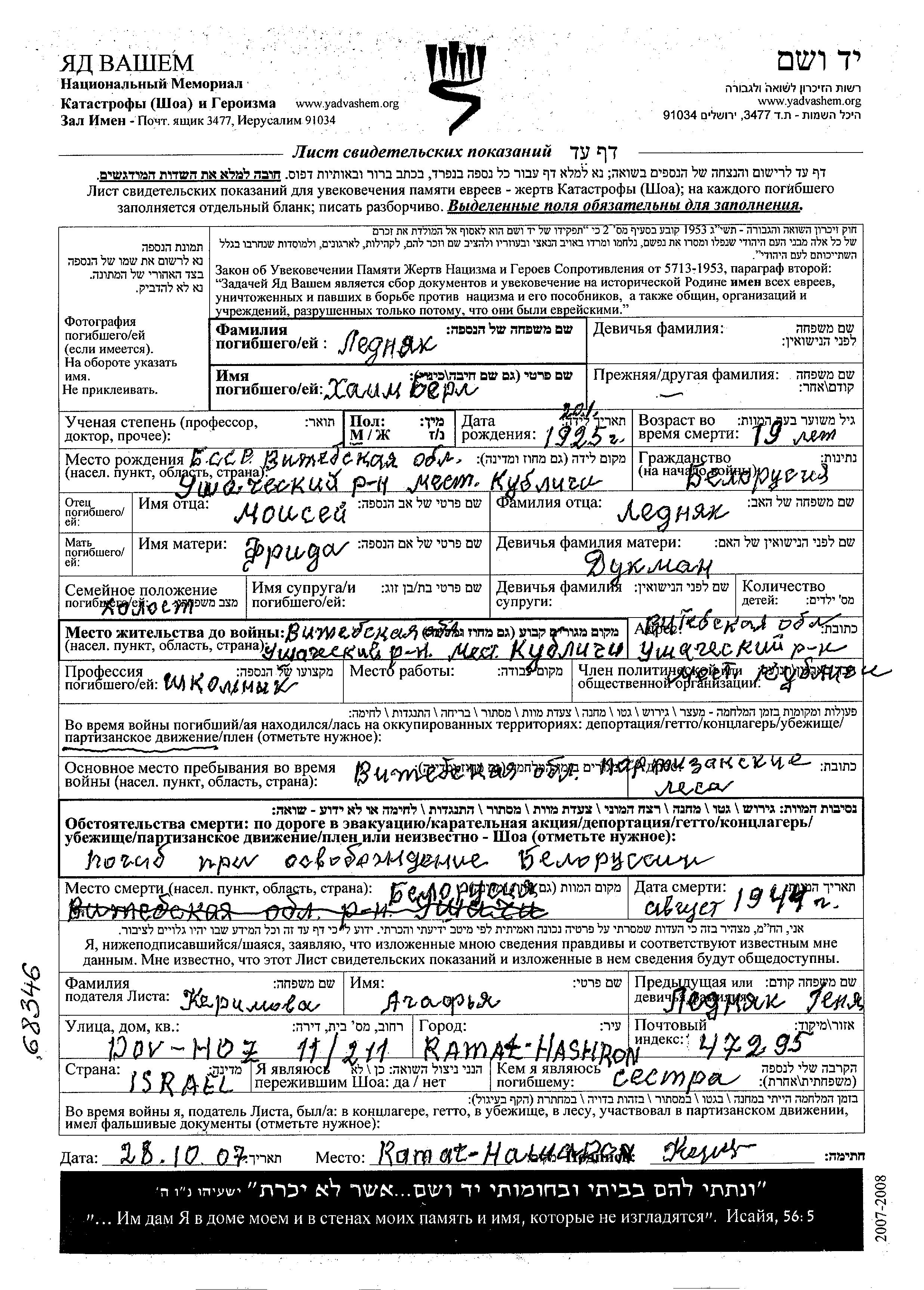 Khaim Berl Lednyak est né à Kublichi, Bélorussie (URSS) en 1925, fils de Moisei et de Frida née Dukman. Il était Écolier et Célibataire. Avant la seconde guerre mondiale il vivait à Kublichi, Bélorussie (URSS). Au cours de la guerre, il était à Vitebsk, Bélorussie (URSS).