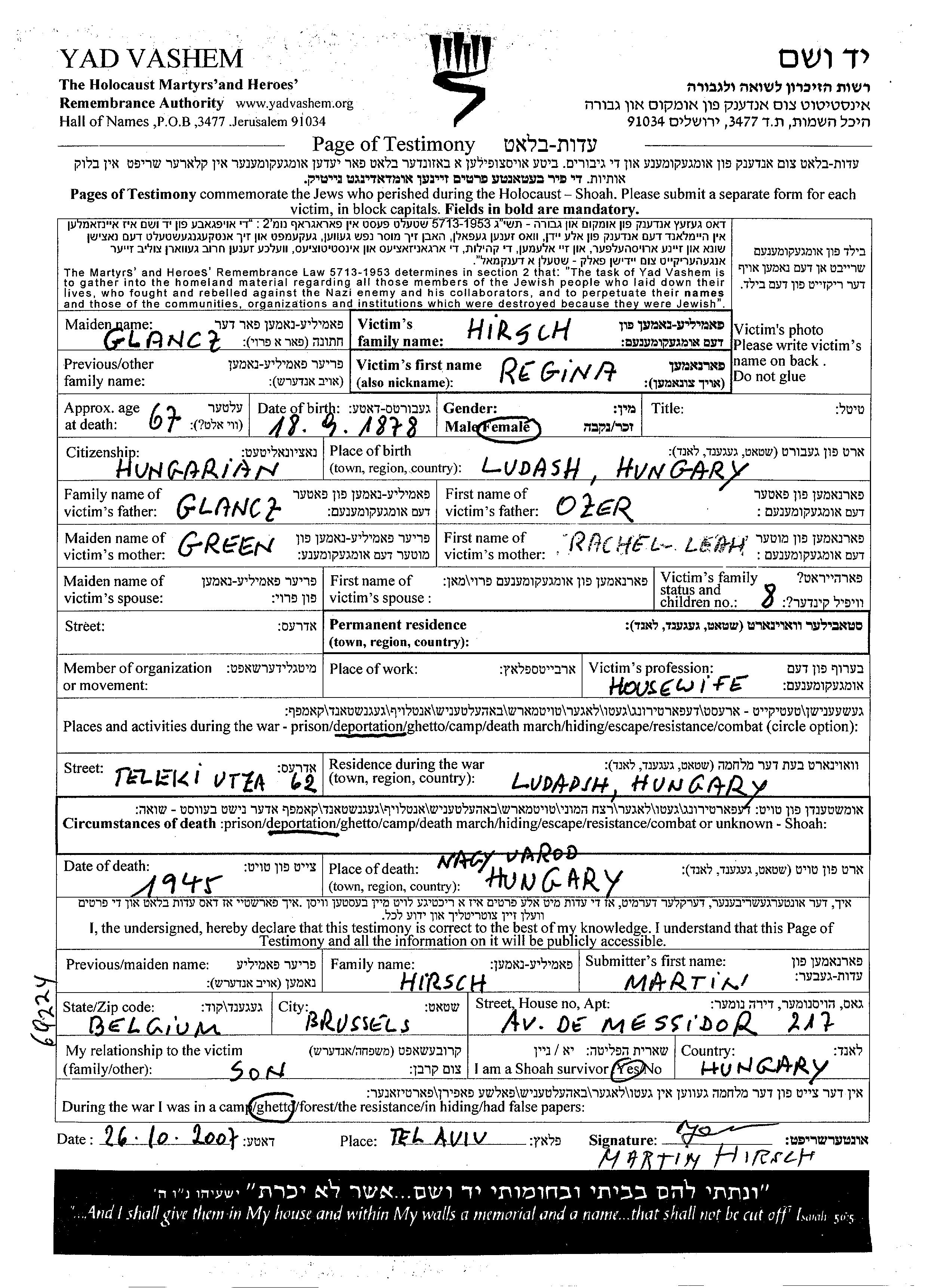 Regina Hirsch née Glancz est née à Ludas en 1878, fille de Ozer et de Rachel Leah née Grin. Elle était Femme au foyer. Pendant la guerre, elle était à Ludas.