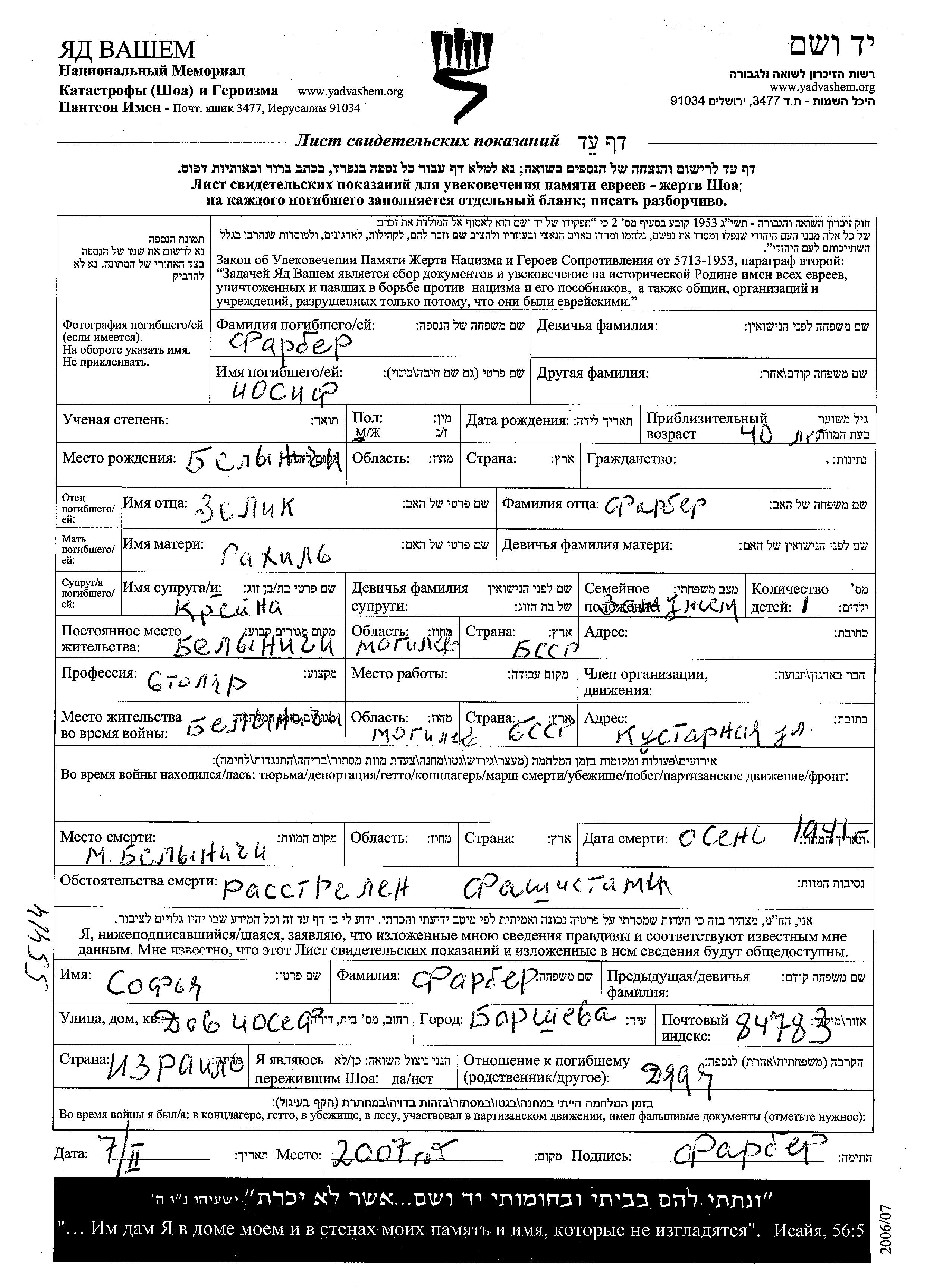 Farber Iosif Belynichi, Bélorussie (URSS) Feuille de témoignage