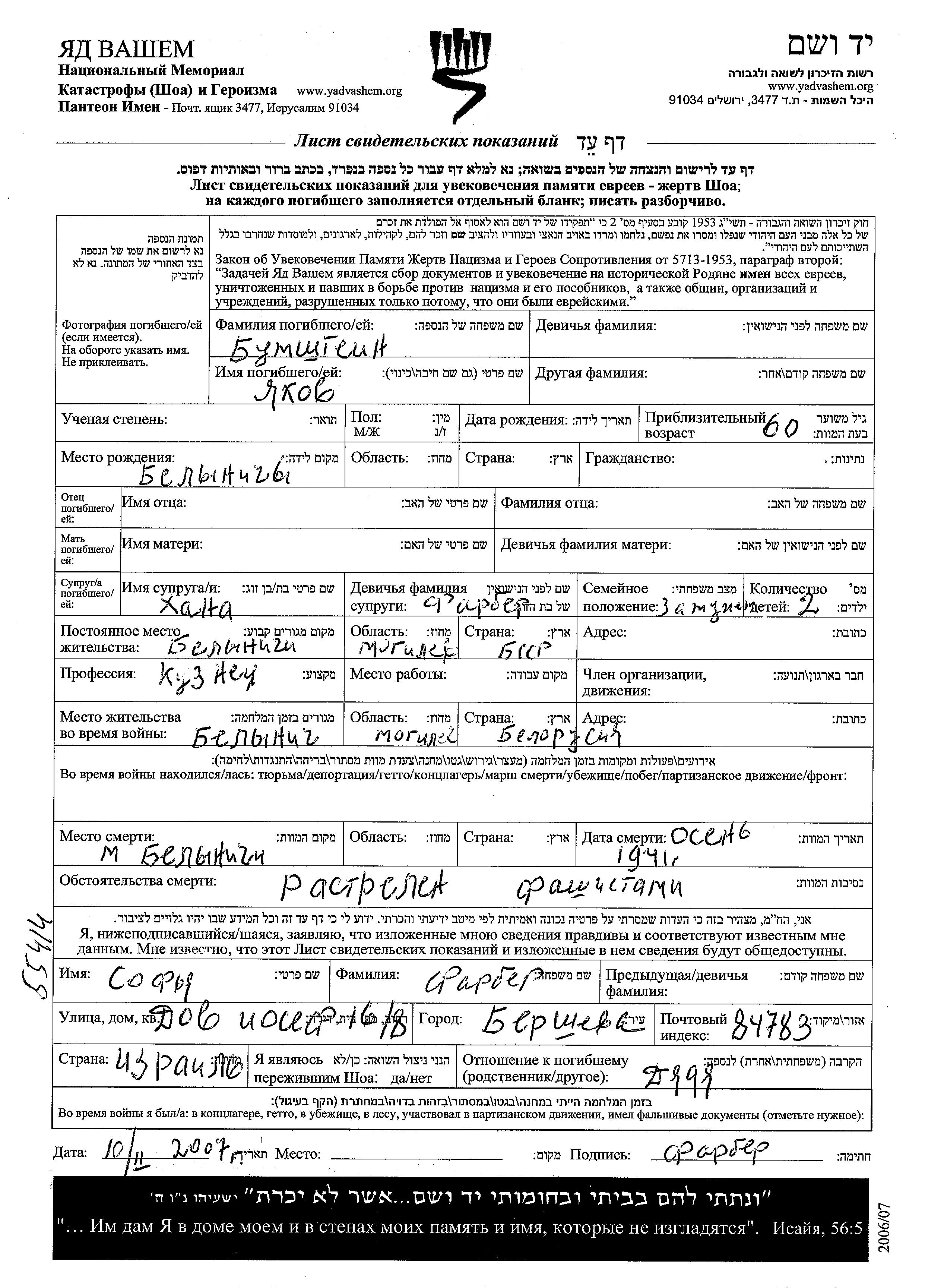 Bumshtein Yakov Belynichi, Bélorussie (URSS) Feuille de témoignage