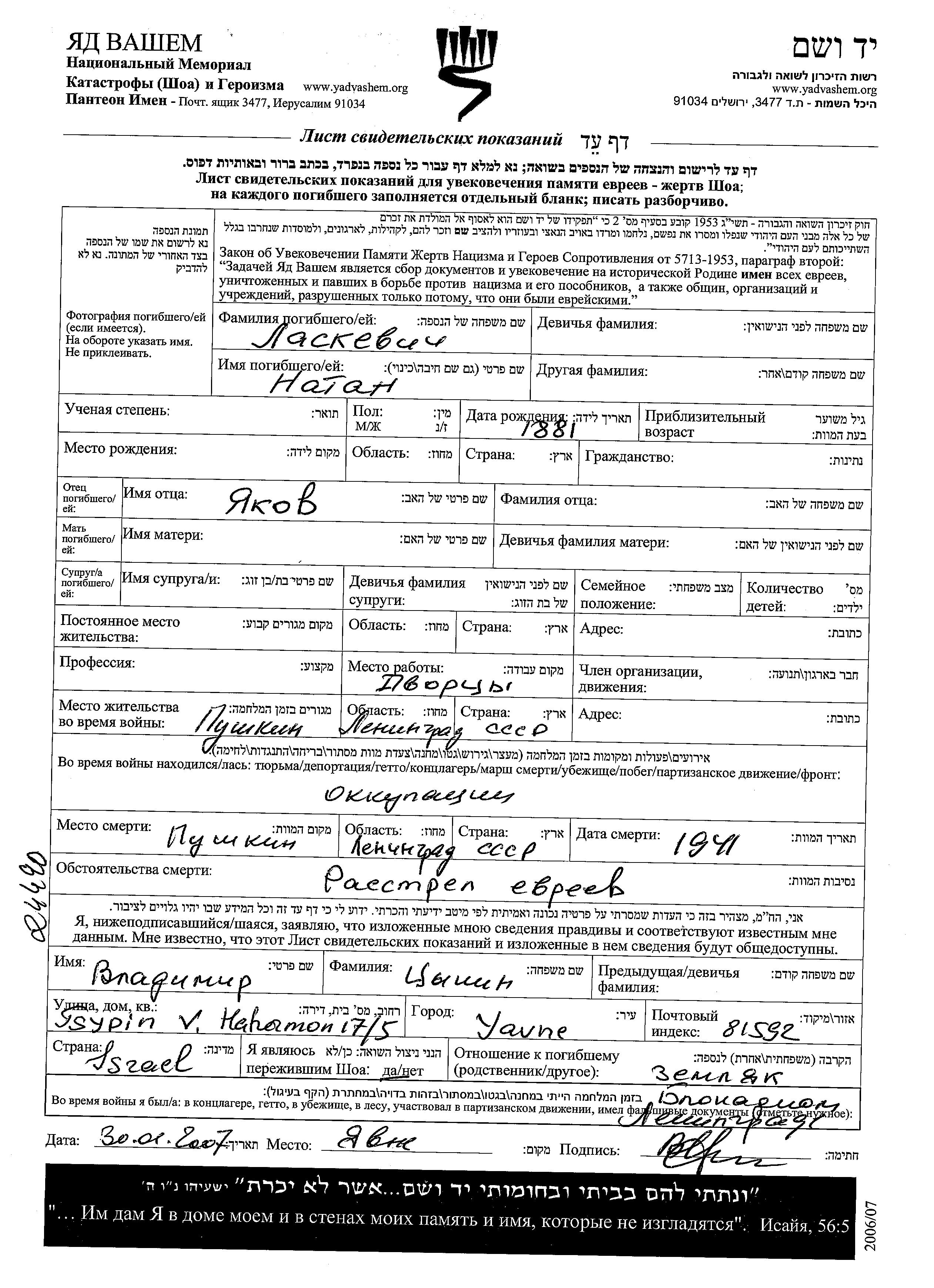 Yad Vashem - Pages of Testimony Names Memorial Collection