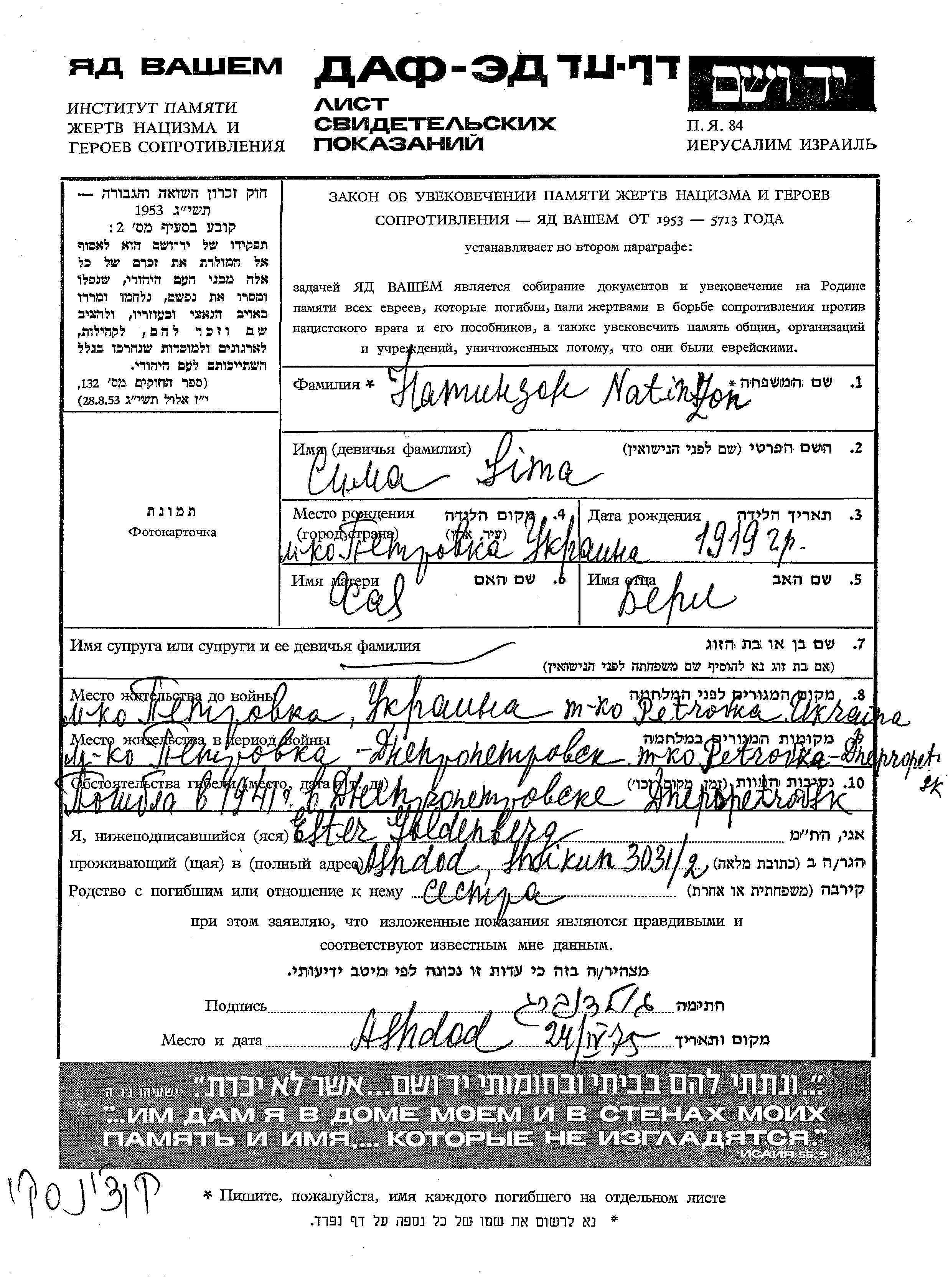 Natinzon Sima 1919 Petrovka, Ukraine (URSS) Feuille de témoignage