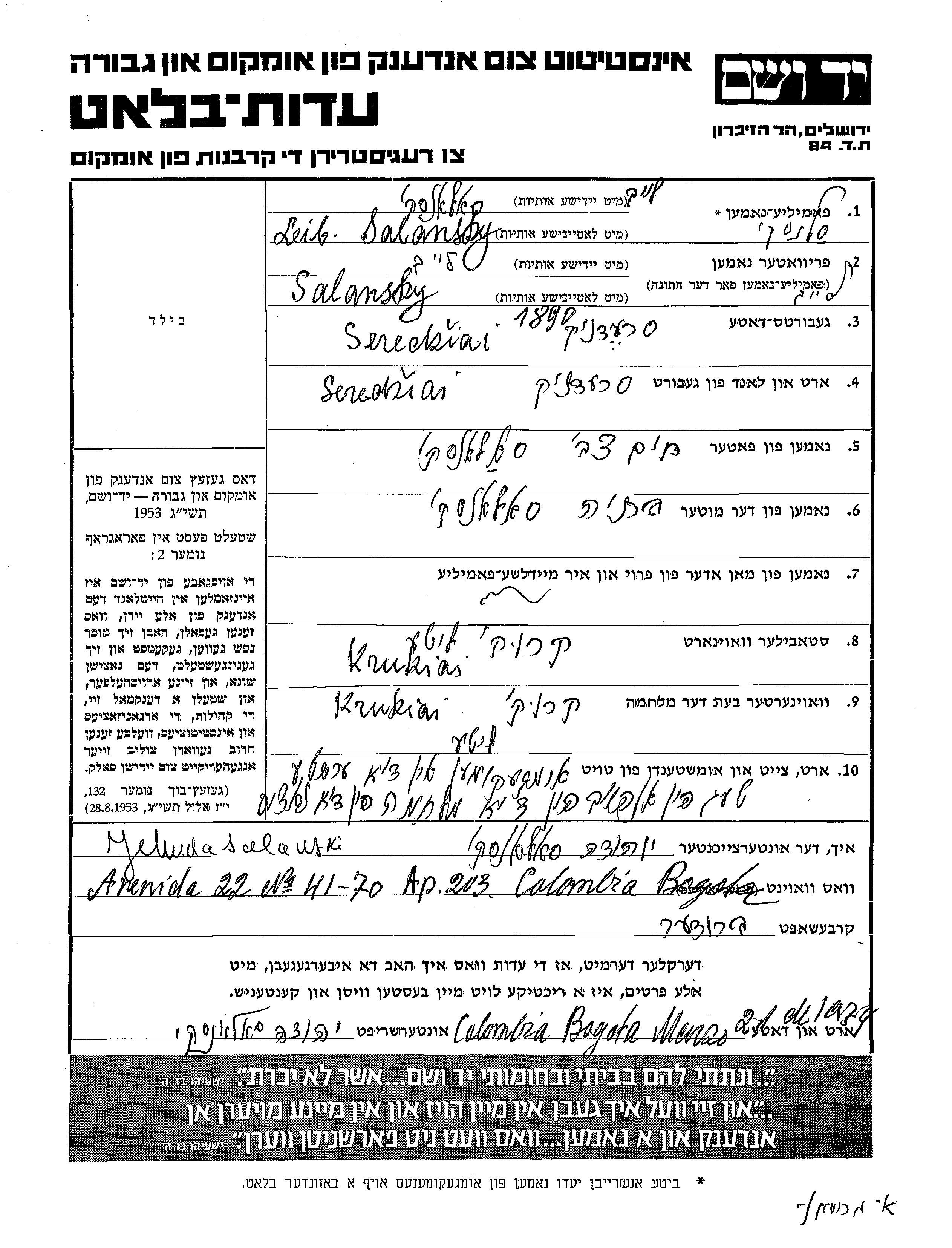 Leib Salansky est né à Serednik, Lituanie en 1890, fils de Khaim Tzvi et de Batia. Avant la seconde guerre mondiale il vivait à Kruki, Lituanie. Au cours de la guerre, il était à Kruki, Lituanie.
