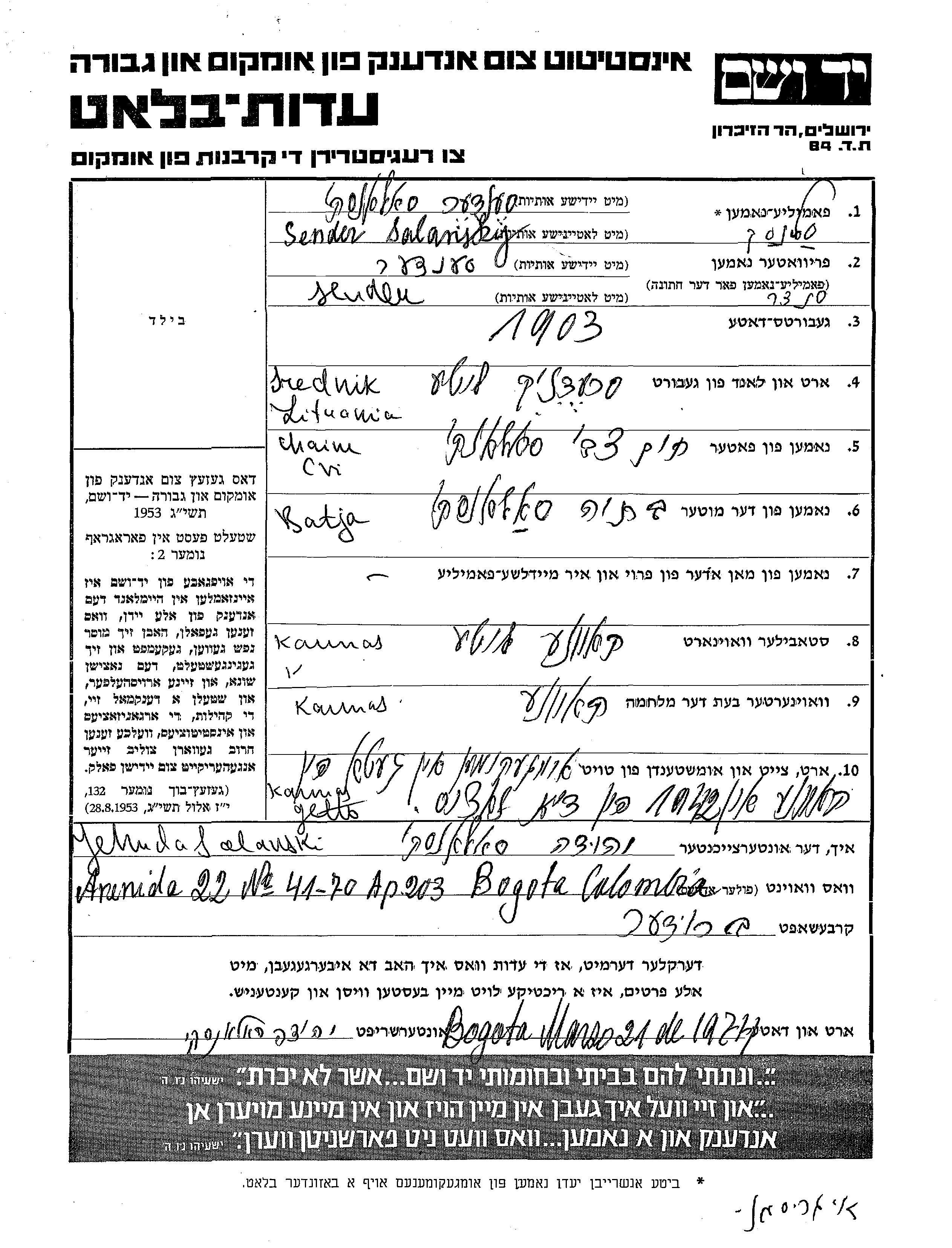 Sender Salansky est né à Srednik, Lituanie en 1903, fils de Chaim Cvi et de Batja. Avant la seconde guerre mondiale il vivait à Kaunas, Lituanie. Au cours de la guerre, il était à Kaunas, Lituanie.