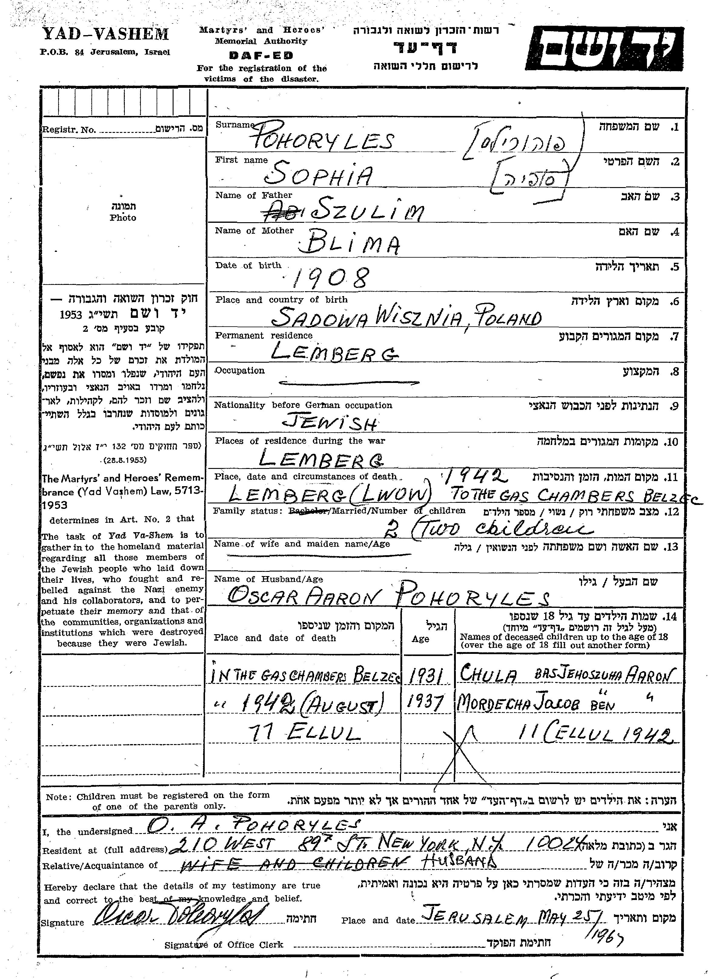 Sophia Pohoryles est née à Sadowa Wisnia, Pologne en 1908, fille de Szulim et de Blima. Elle était Mariée à Oskar Aaron. Avant la seconde guerre mondiale elle vivait à Lemberg, Pologne. Pendant la guerre, elle était à Lemberg, Pologne.